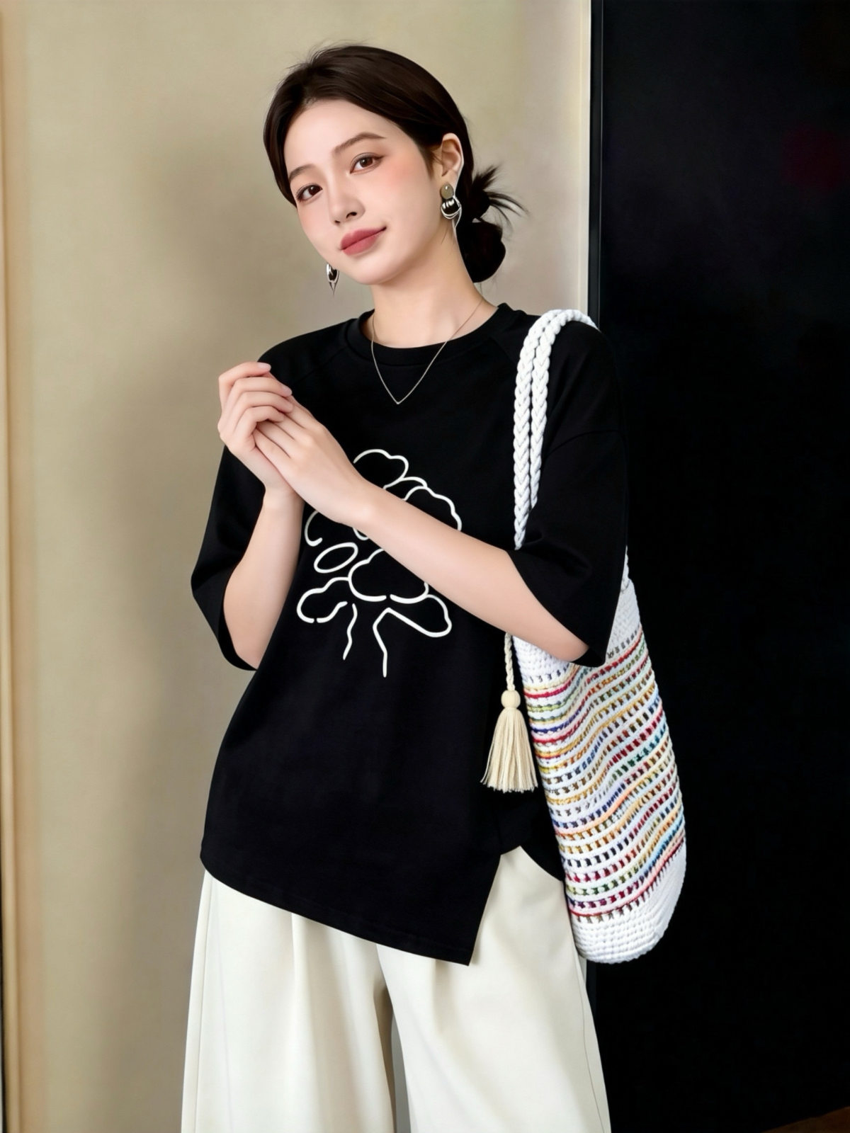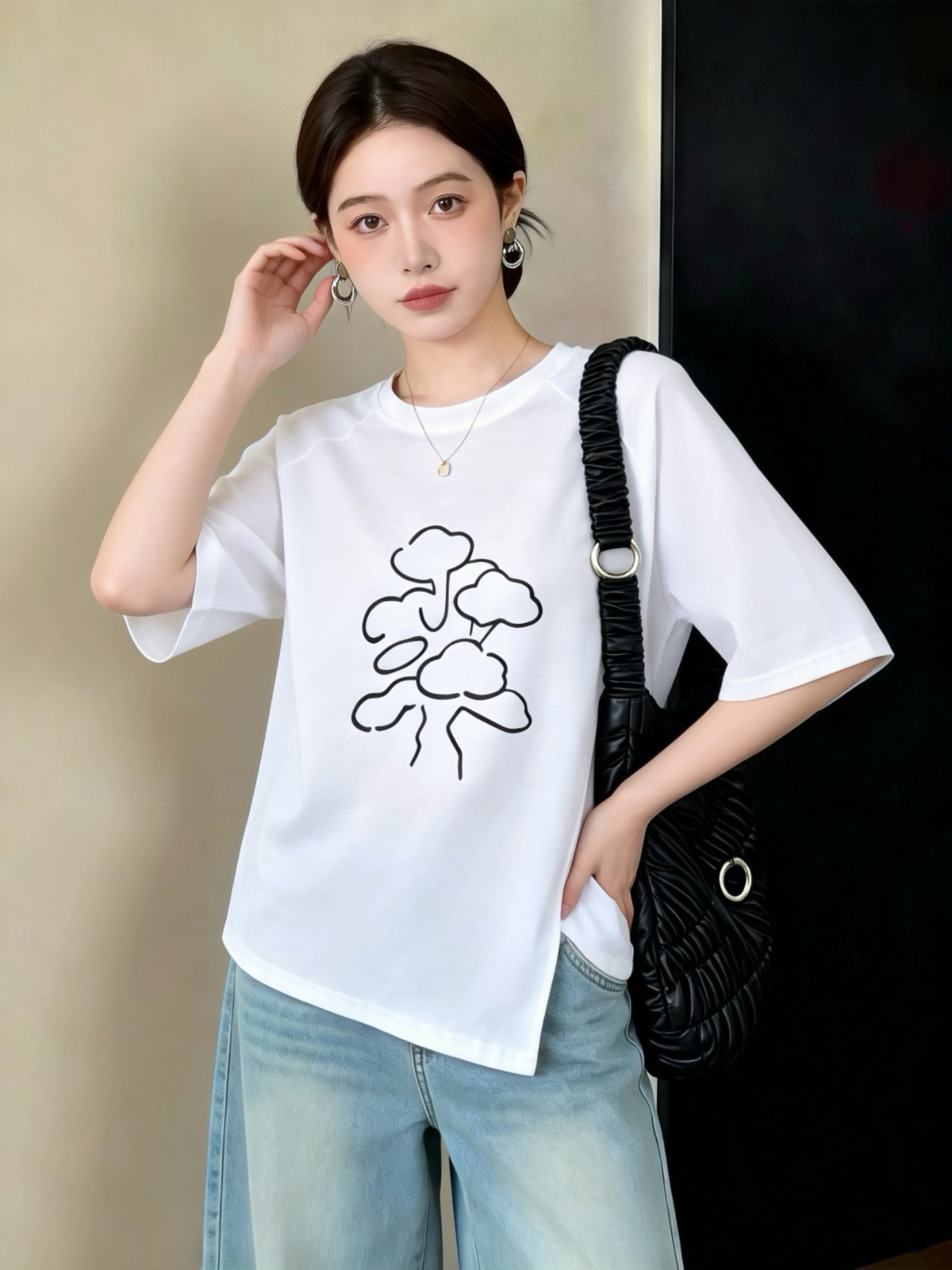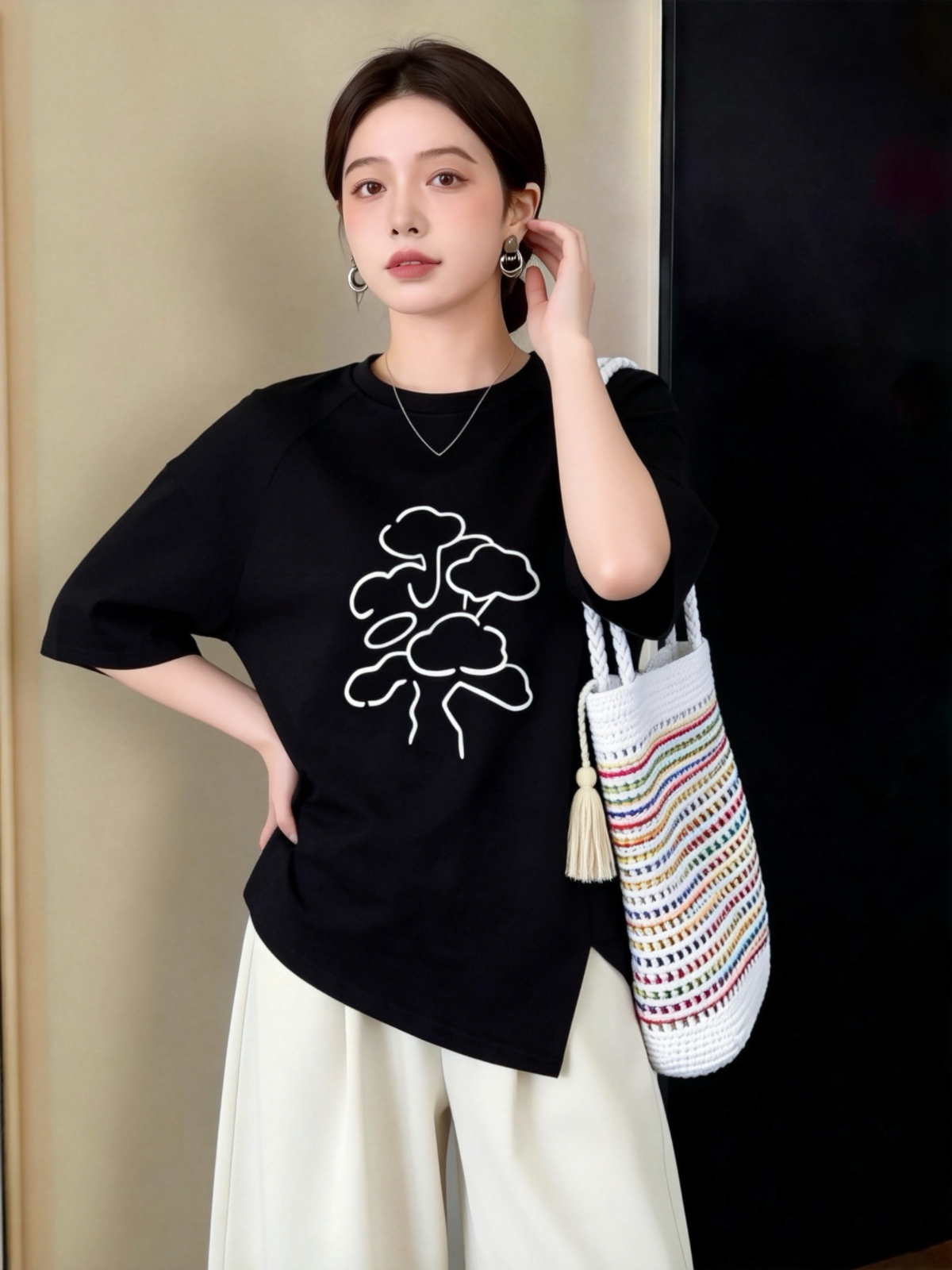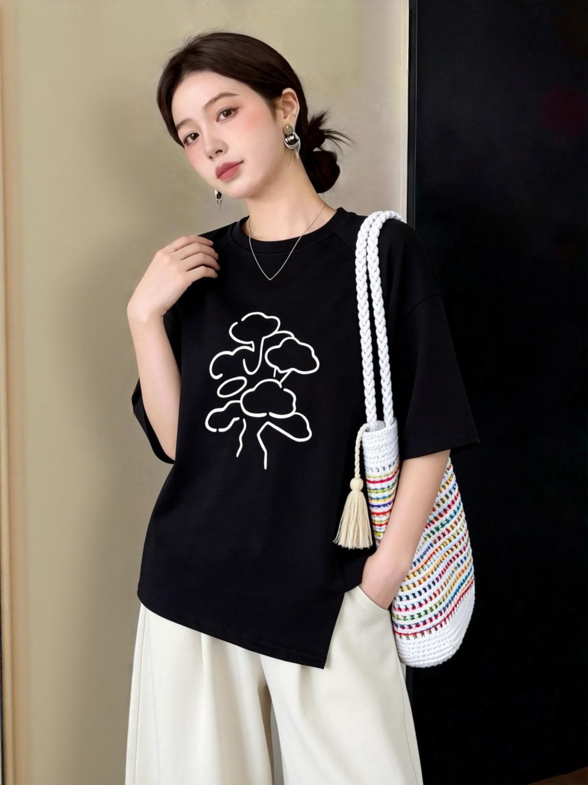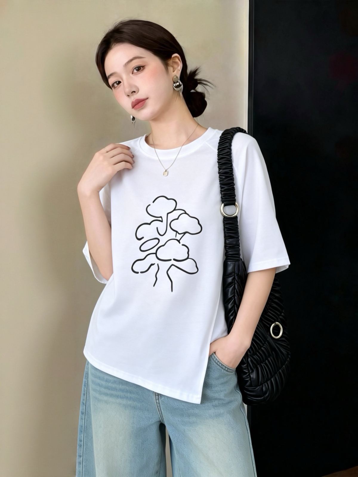 실사 빅 사이즈 여성 의류 새로운 비스듬한 어깨 루즈핏 슬림해 보이는 패션 루즈핏 다용도 프린트 반팔 티셔츠