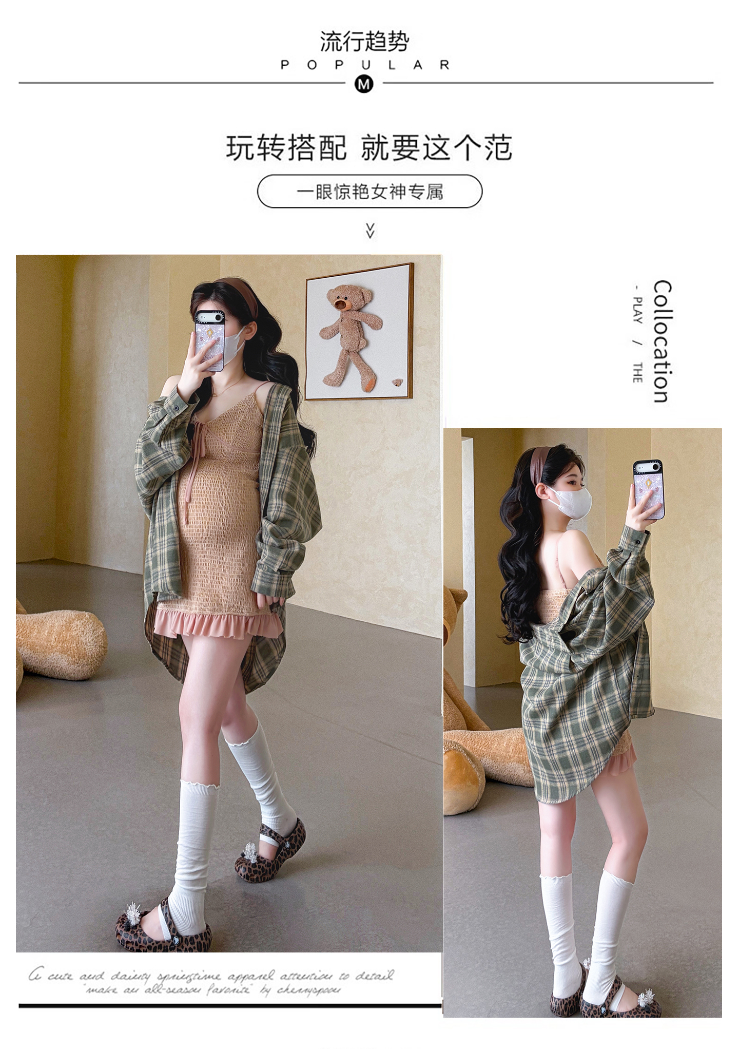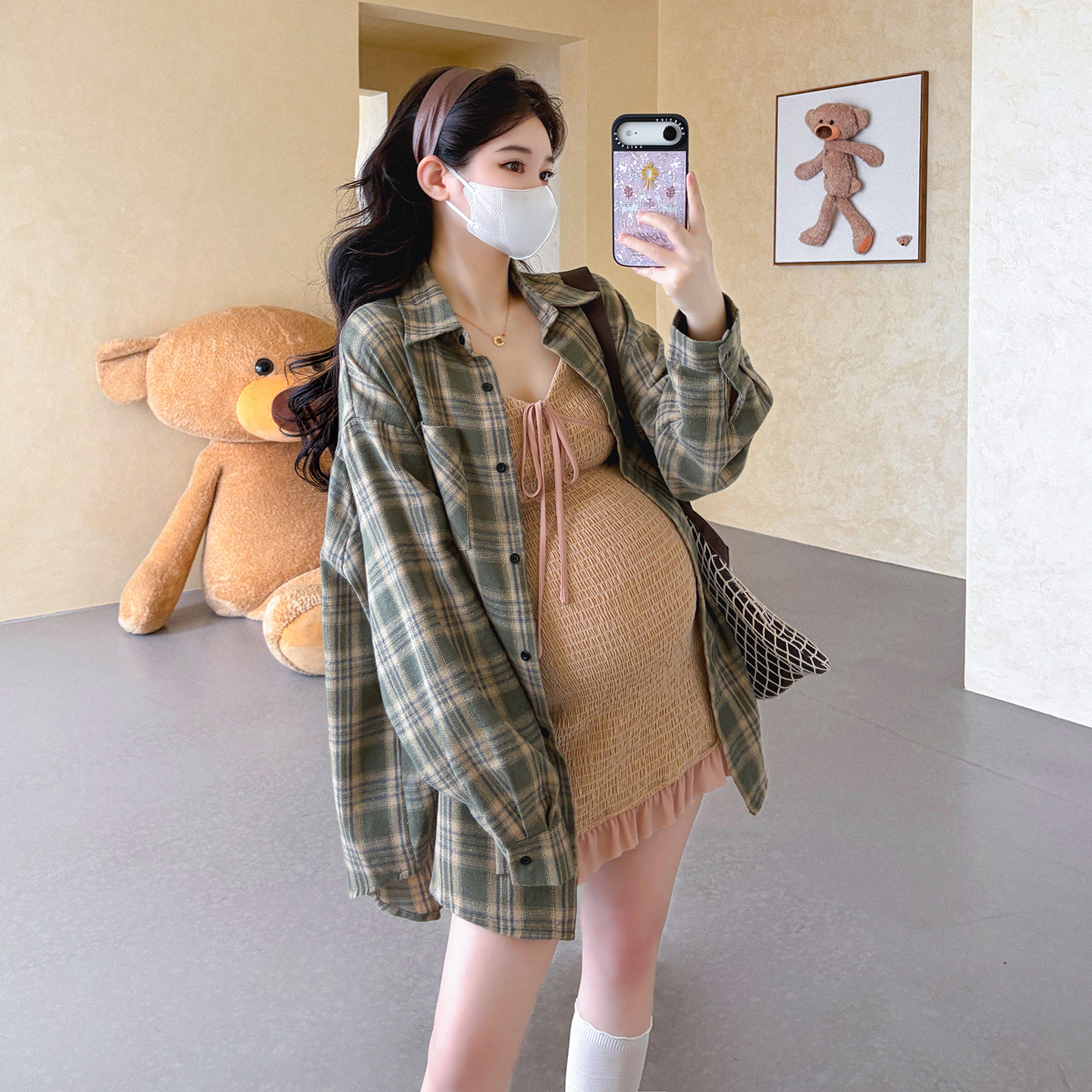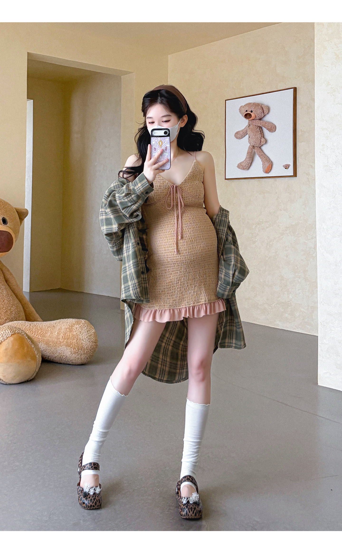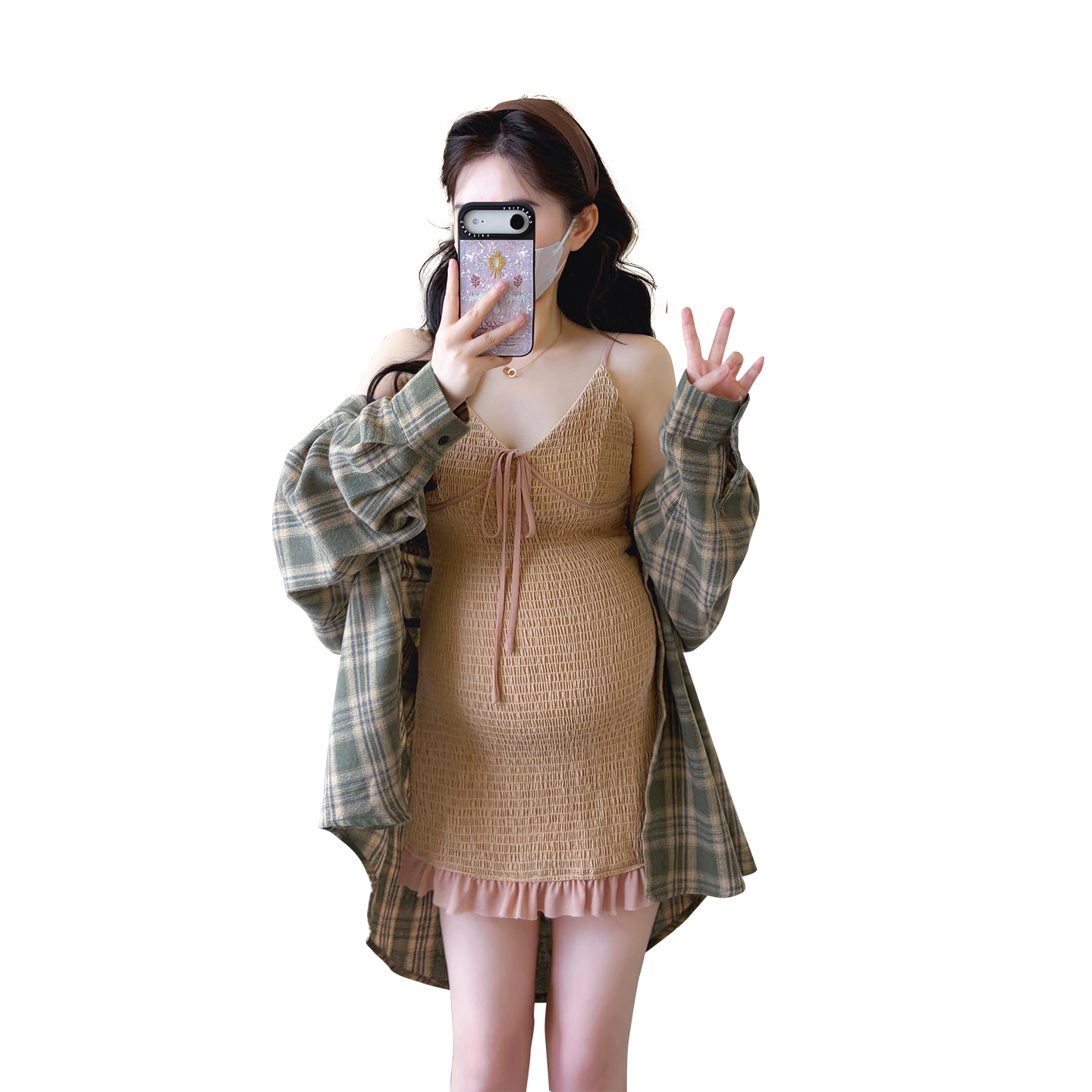 실사 지금 임산부 V넥 레이스업 드레스 몸매 가꾸기 매운맛 엄마 슬립 드레스 레트로 체크무늬 셔츠 세트