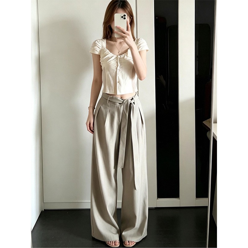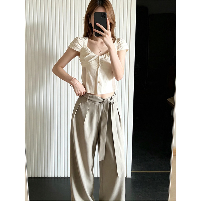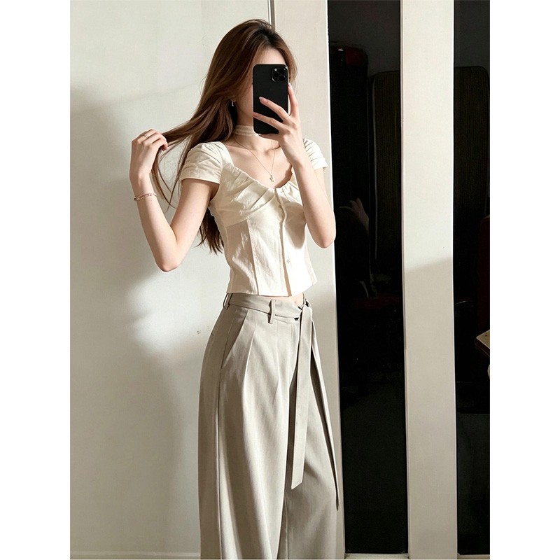 정가 재고 있음 한 부서 분위기 센스 광장 칼라 반팔 허리 수축 여성 셔츠 품격 하이웨이스트 슬림해 보이는 와이드 레그 팬츠 세트