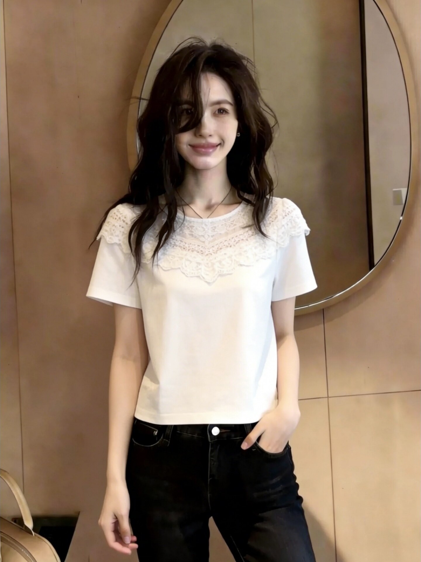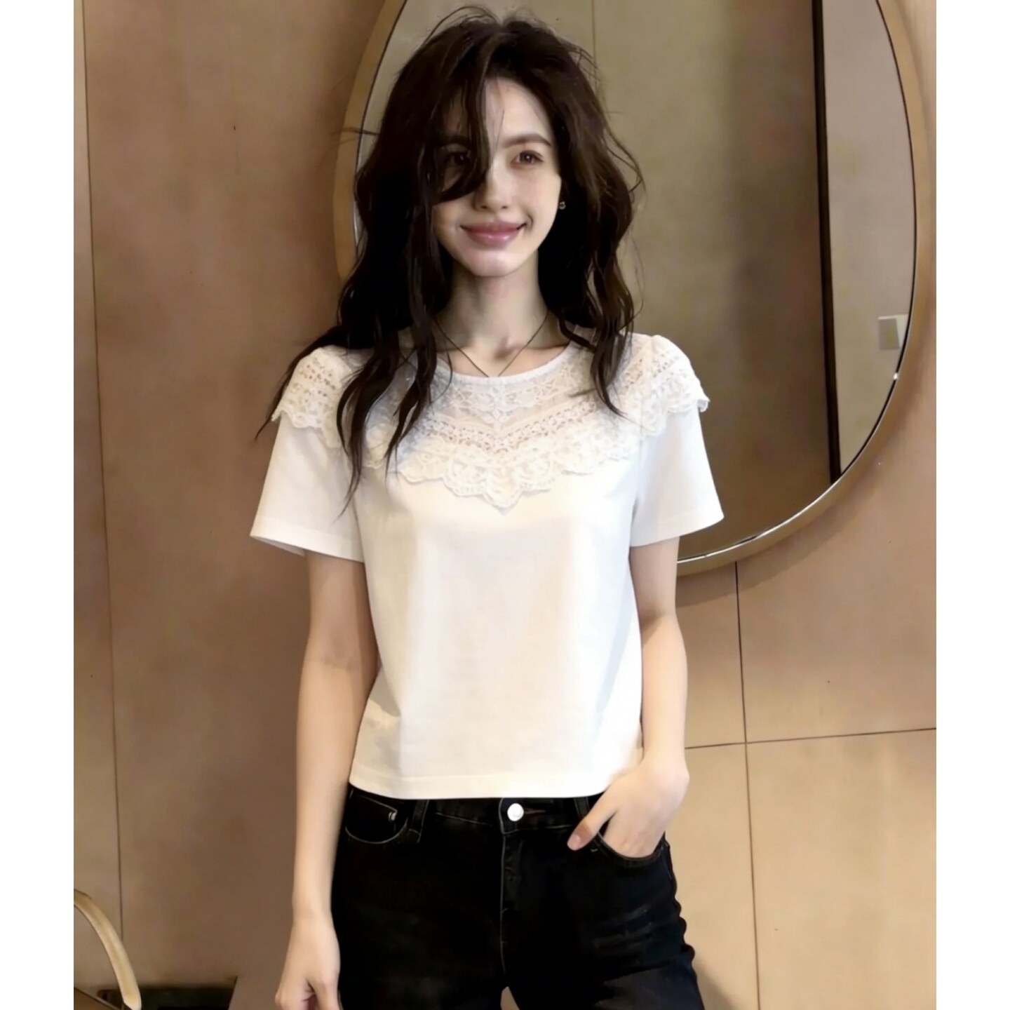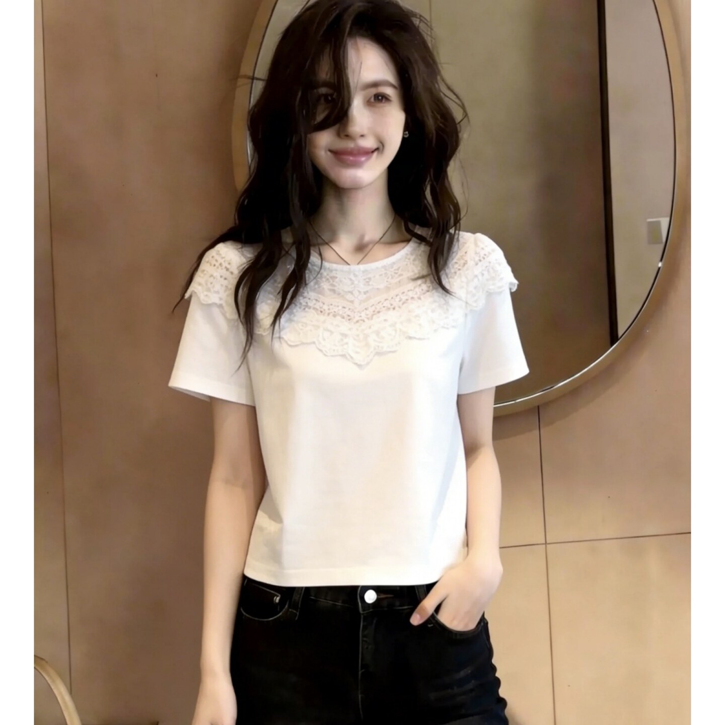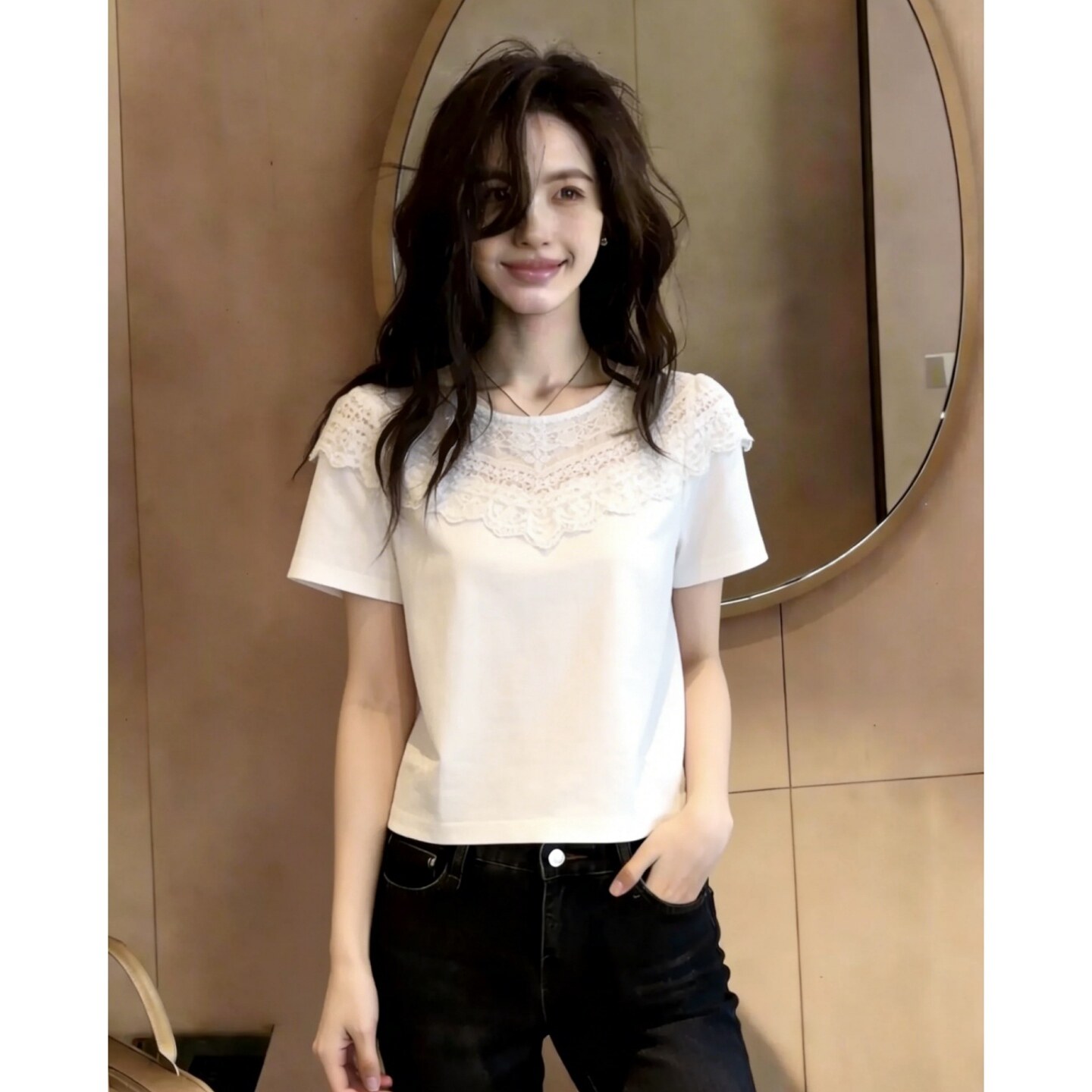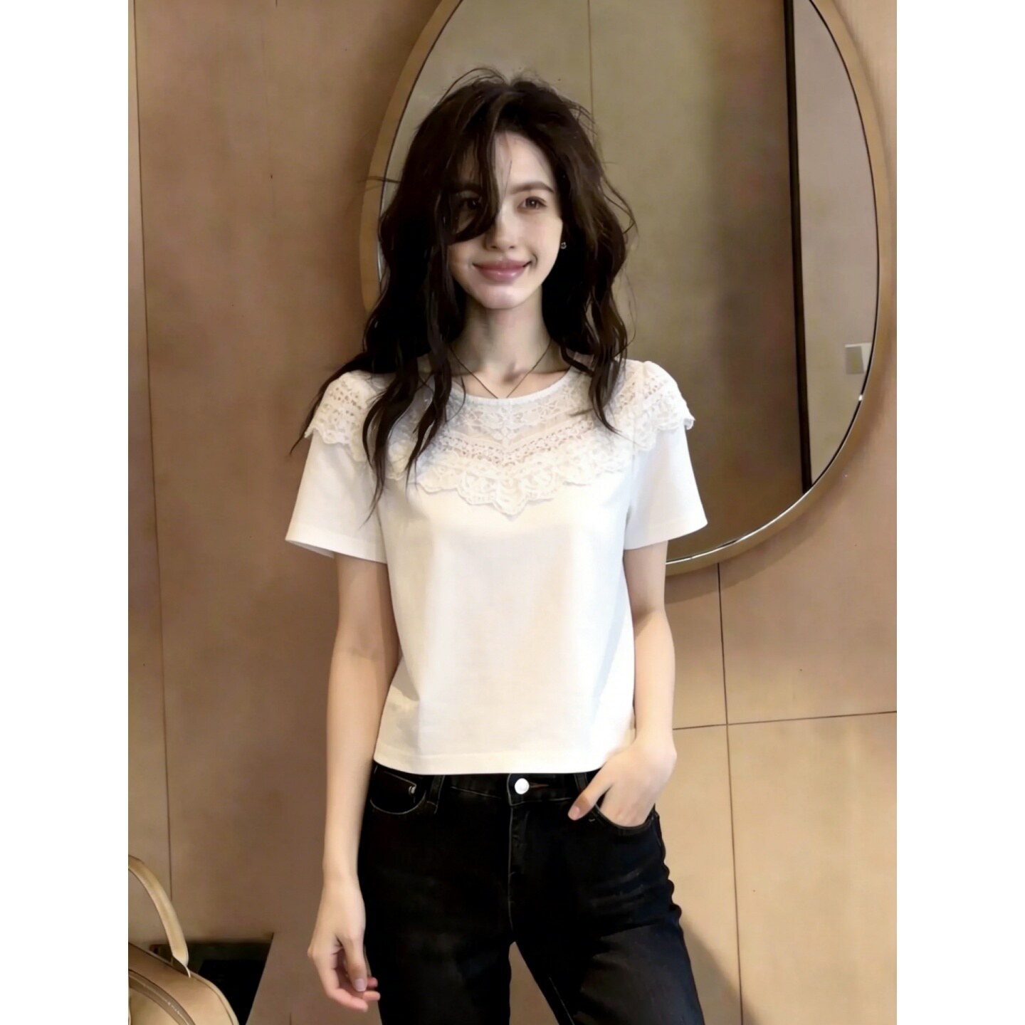2026 여름 새로운 프랑스식 레이스 레이스 패치워크 반팔 맨위 여성 비틀림 디자인 센스 작은 대중 커피 색상 티셔츠