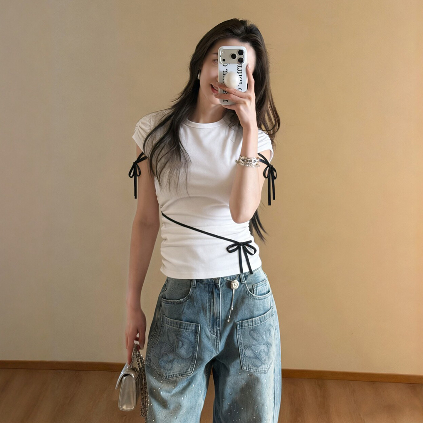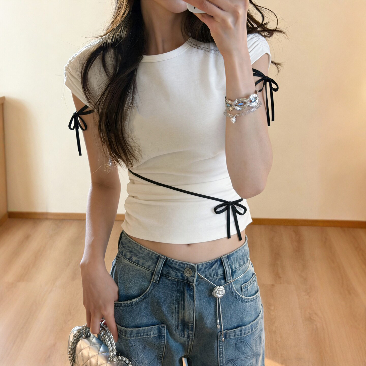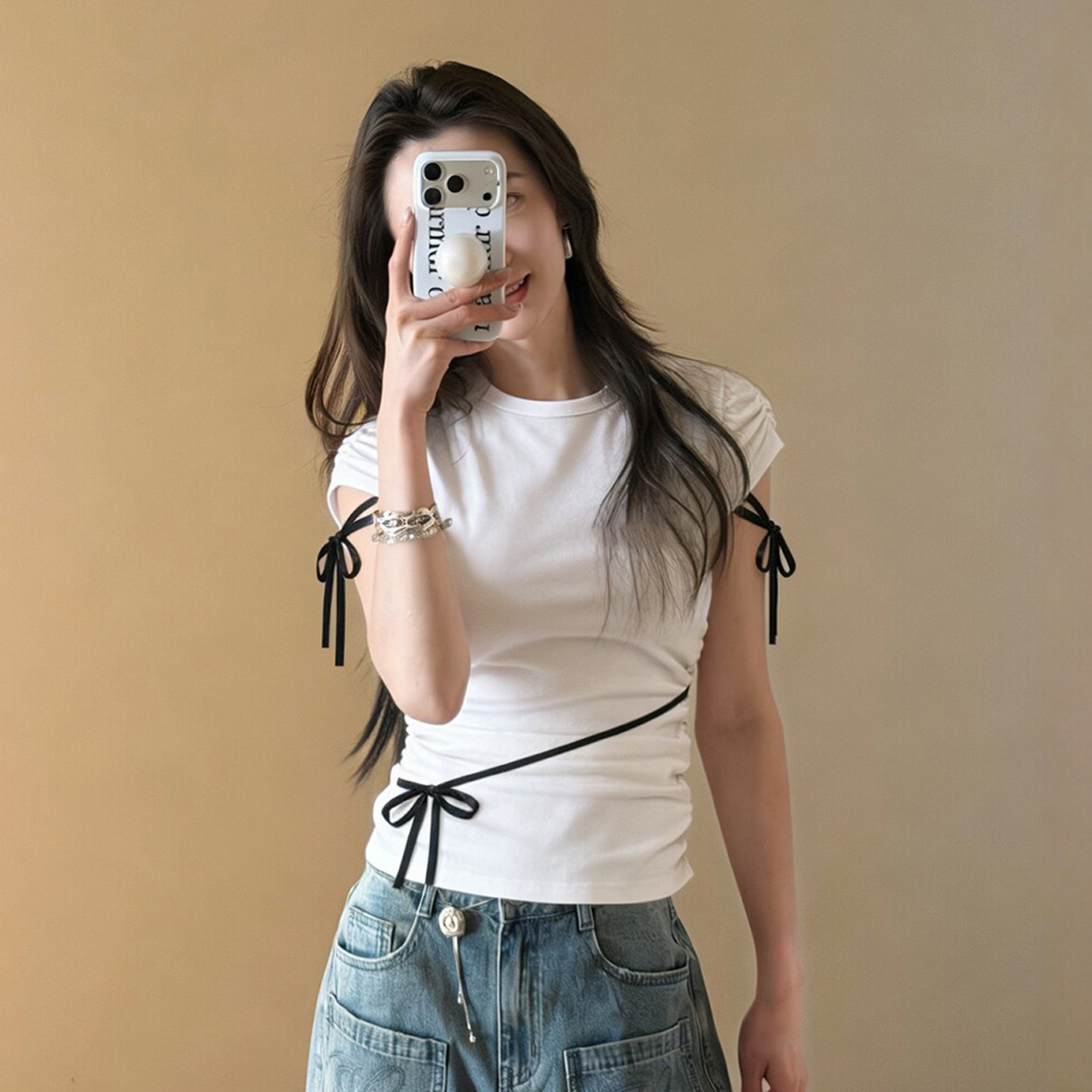 정가 재고 있음 순수한 욕망 화이트 반팔 라운드 넥 긍정적 인 어깨 티셔츠 여성 2026 여름 새로운 작은 키 허리 수축 맨위