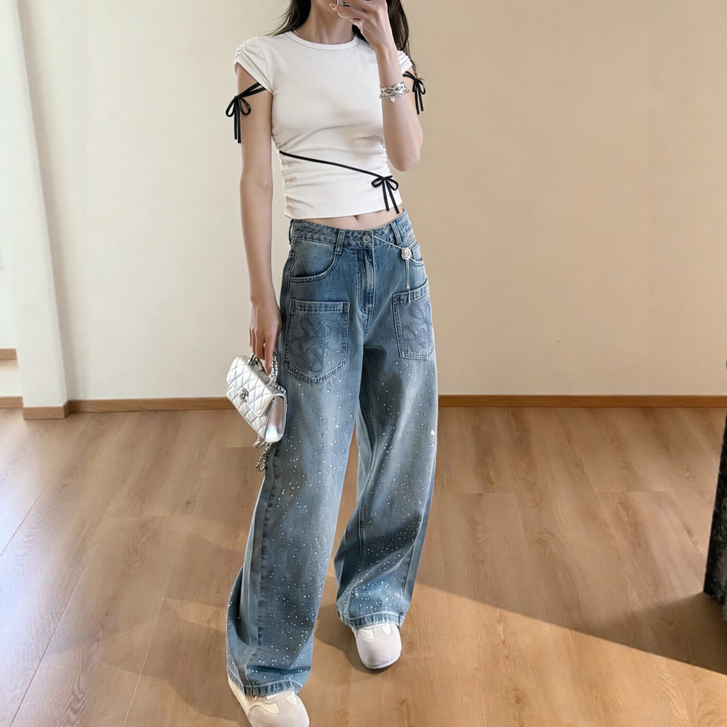 정가 재고 있음 여름 디자인 센스 몸매 가꾸기 달콤한 매운맛 쇼트 스타일 민소매 맨위 레트로 패션 와이드 레그 팬츠 투피스 세트