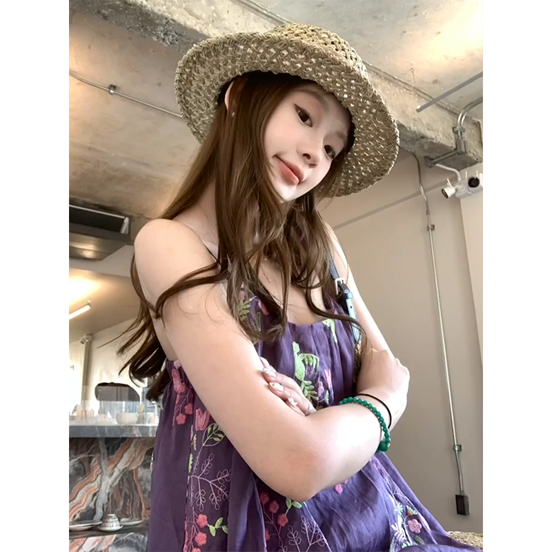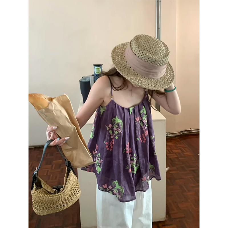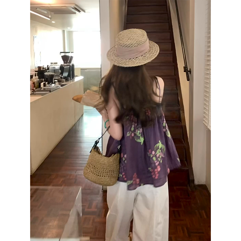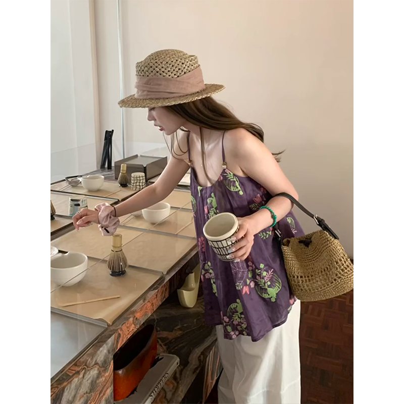 정가 재고 있음 부드러운 달콤한 스타일 보라색 프린트 한 마디 캐미솔 맨위 루즈핏 넓은 다리 캐주얼 바지 세트