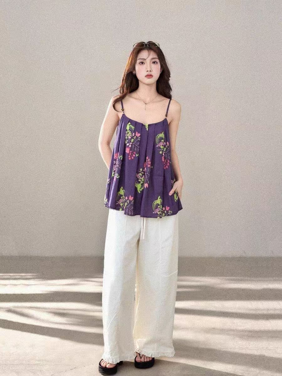 정가 재고 있음 부드러운 달콤한 스타일 보라색 프린트 한 마디 캐미솔 맨위 루즈핏 넓은 다리 캐주얼 바지 세트
