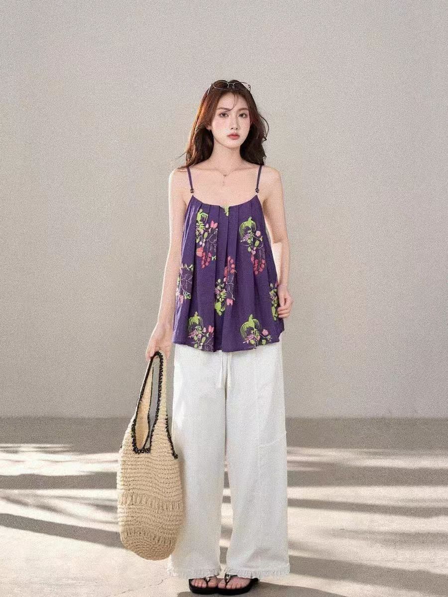 정가 재고 있음 한 부서 달콤한 스타일 보라색 자수 슬립 맨위 여성 품격 하이웨이스트 슬림해 보이는 와이드 레그 팬츠 세트