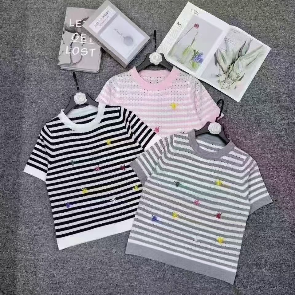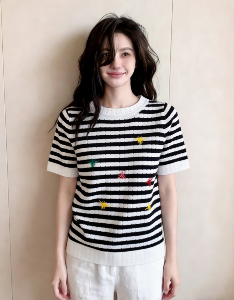 품격 디스플레이 화이트 출퇴근 배색 스트라이프 자수 알파벳 라운드 넥 반팔 니트 스웨터 여성 다용도 슬림해 보이는 풀오버 맨위