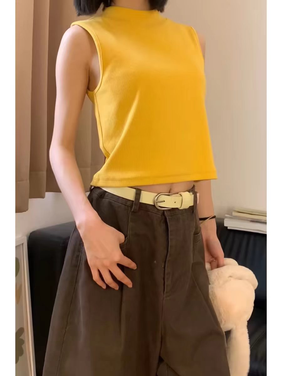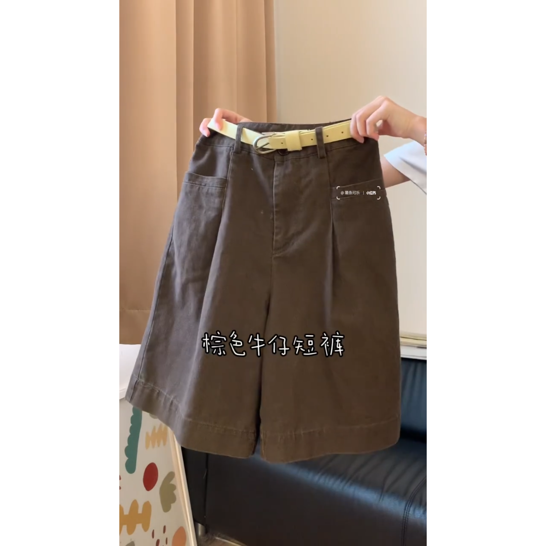 정가 재고 있음 패션 다용도 몸매 가꾸기 쇼트 스타일 민소매 맨위 여성 하이웨이스트 슬림해 보이는 커피 색상 데님 바지 세트