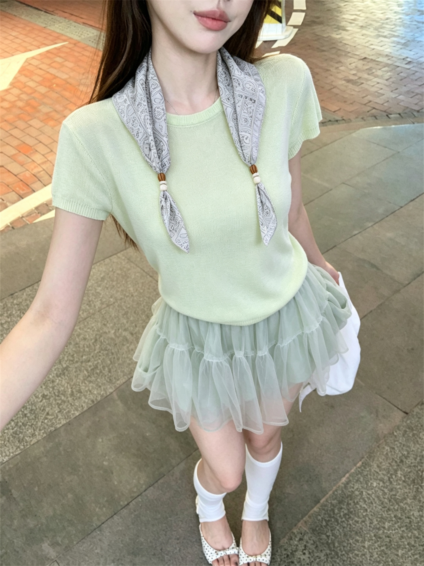 송 긍정적 인 En 녹색 페이크 레이어드 패치워크 긍정적 인 어깨 반팔 티셔츠 여성 여름 몸매 가꾸기 한 부서 아름다운 고유 한 작은 맨위