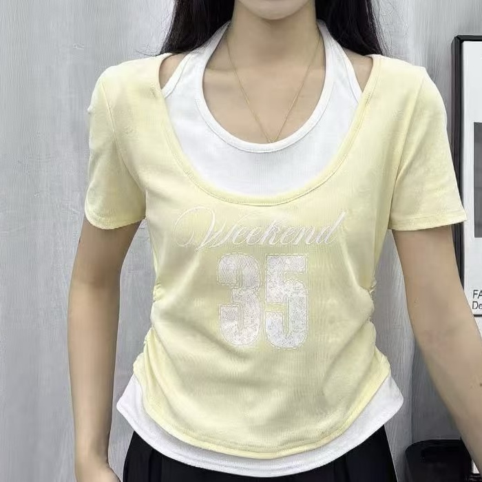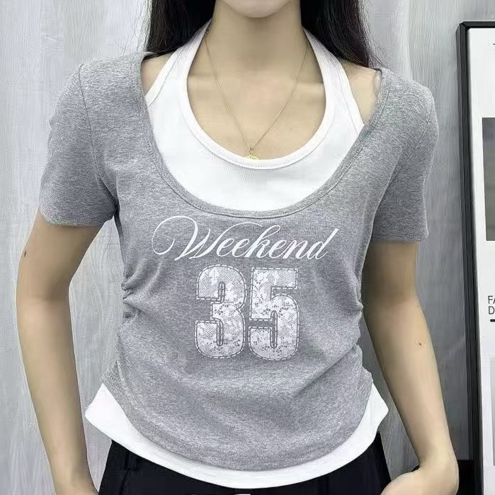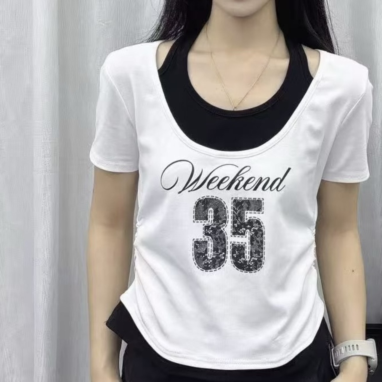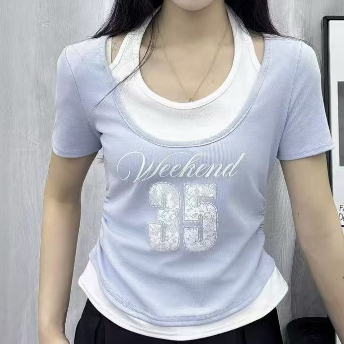 디자인 센스 페이크 레이어드 행침 목 비스듬한 어깨 반팔 티셔츠 여성 여름 새로운 슬림해 보이는 품격 작은 셔츠 연령 감소 맨위 서비스