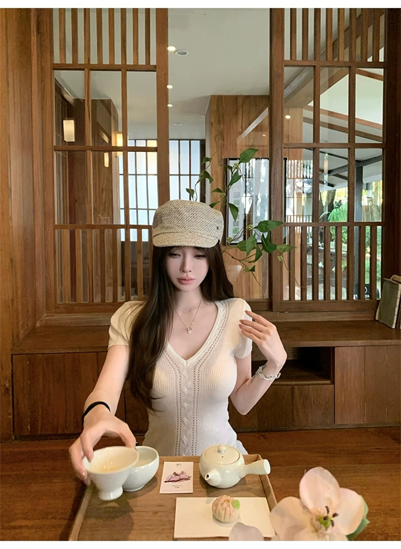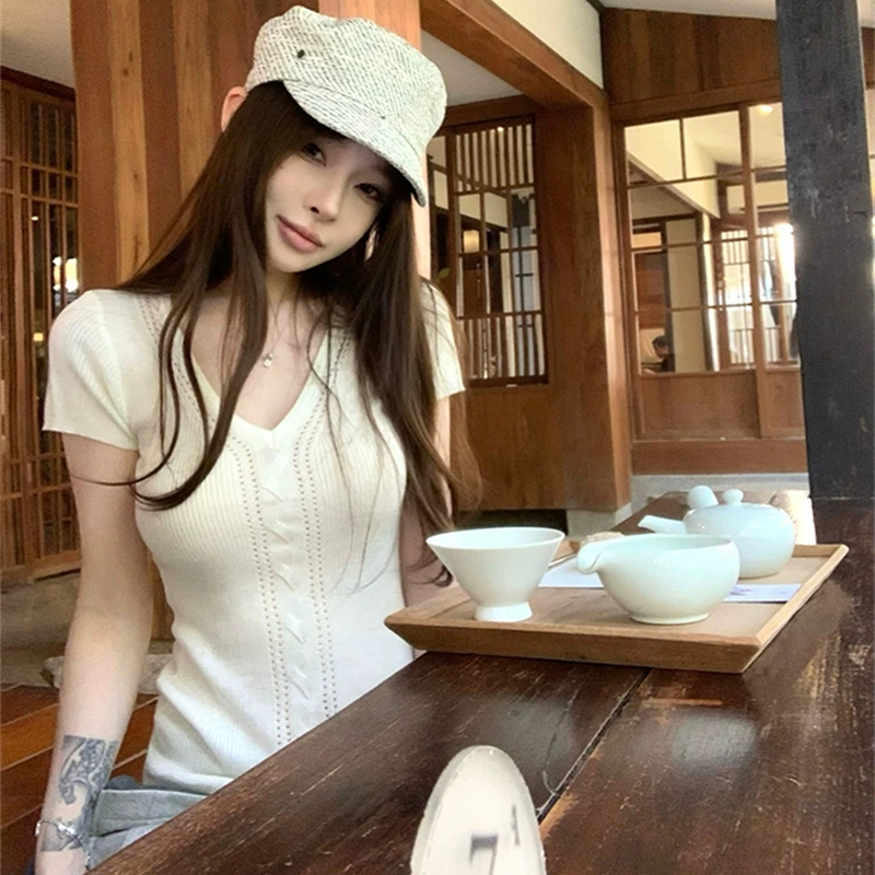 한 부서 V넥 니트 반팔 티셔츠 여성 여름 디자인 센스 Chic 몸매 가꾸기 슬림해 보이는 순수한 욕망 바람 핫걸 외출용 맨위