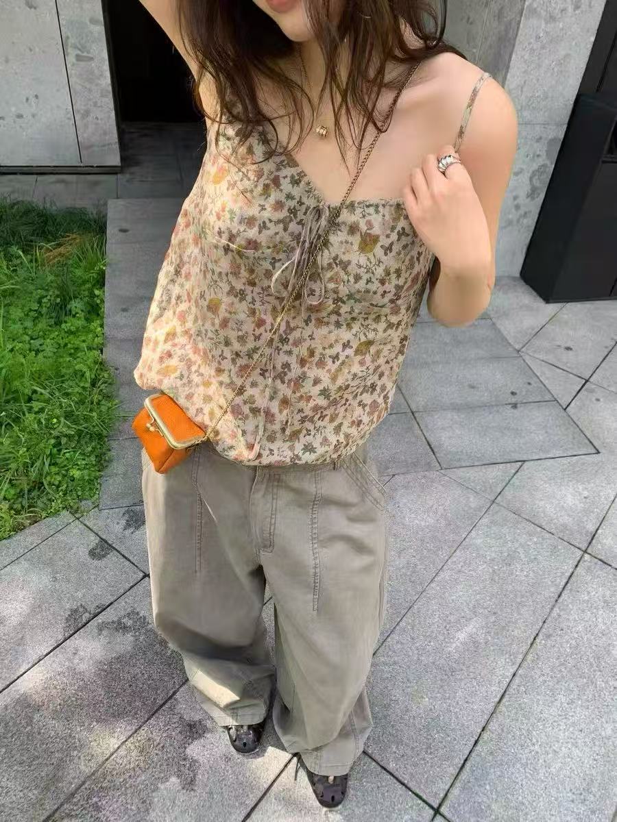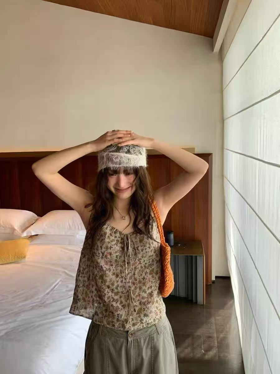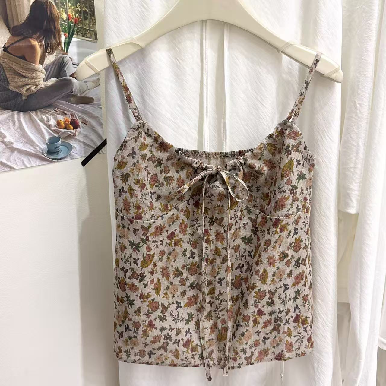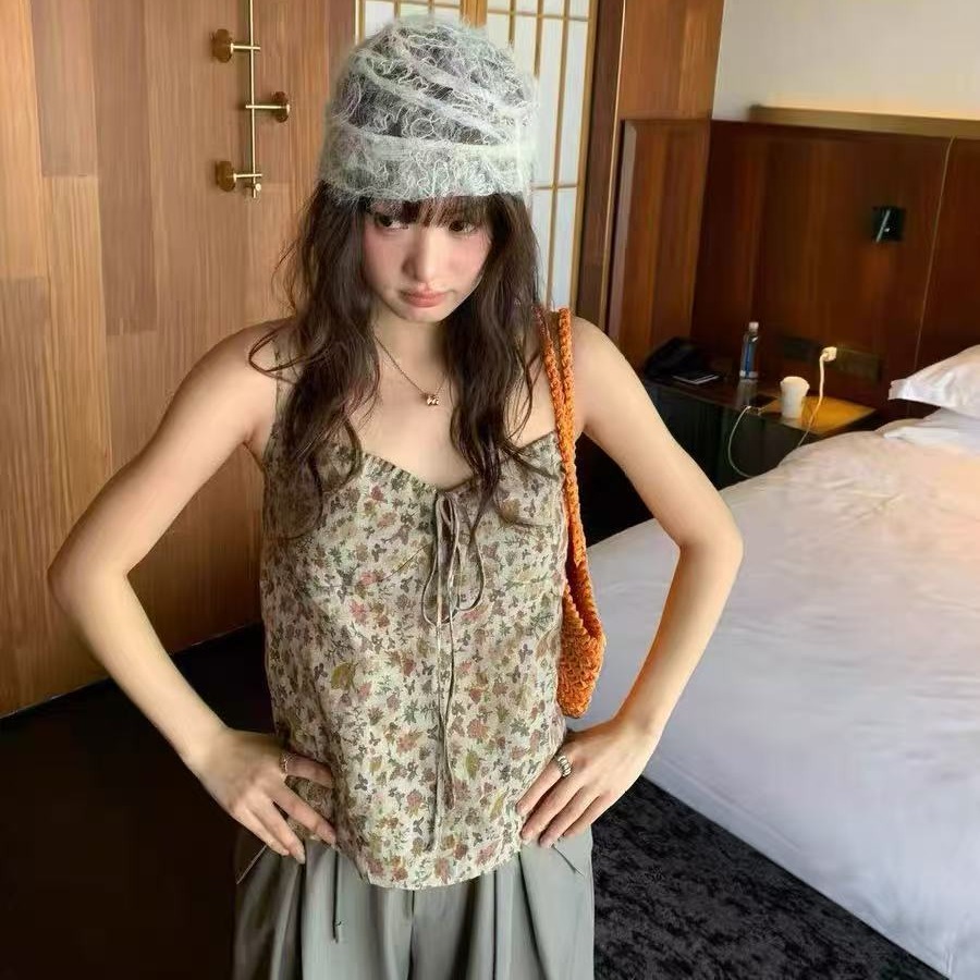 레트로 꽃무늬 홀로우 아웃 V넥 레이스업 민소매 캐미솔 여름 외출용 펌프 로프 나비 매듭 루즈핏 맨위