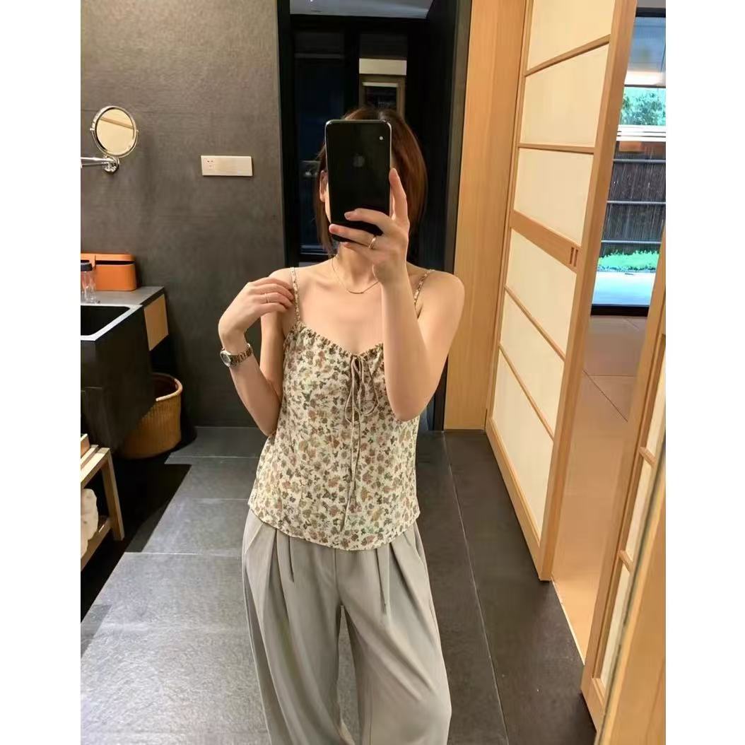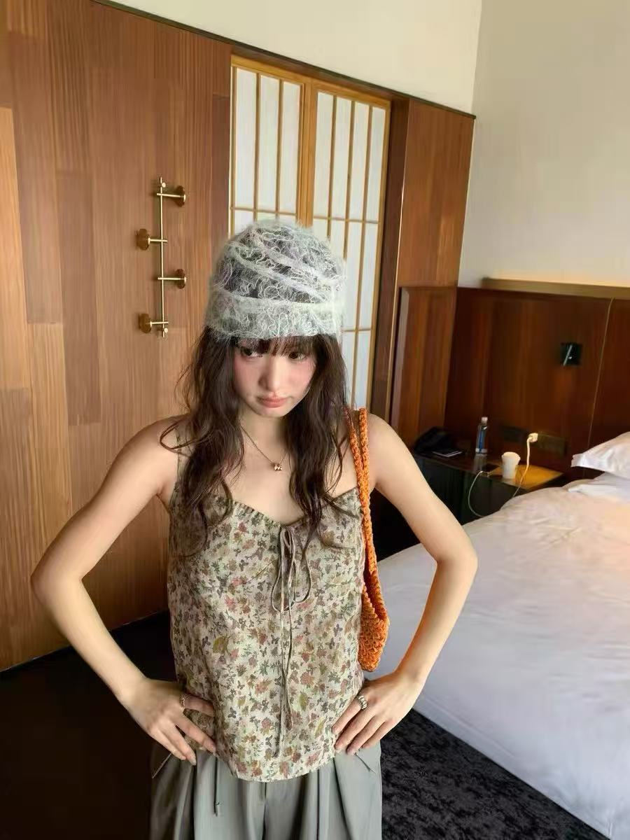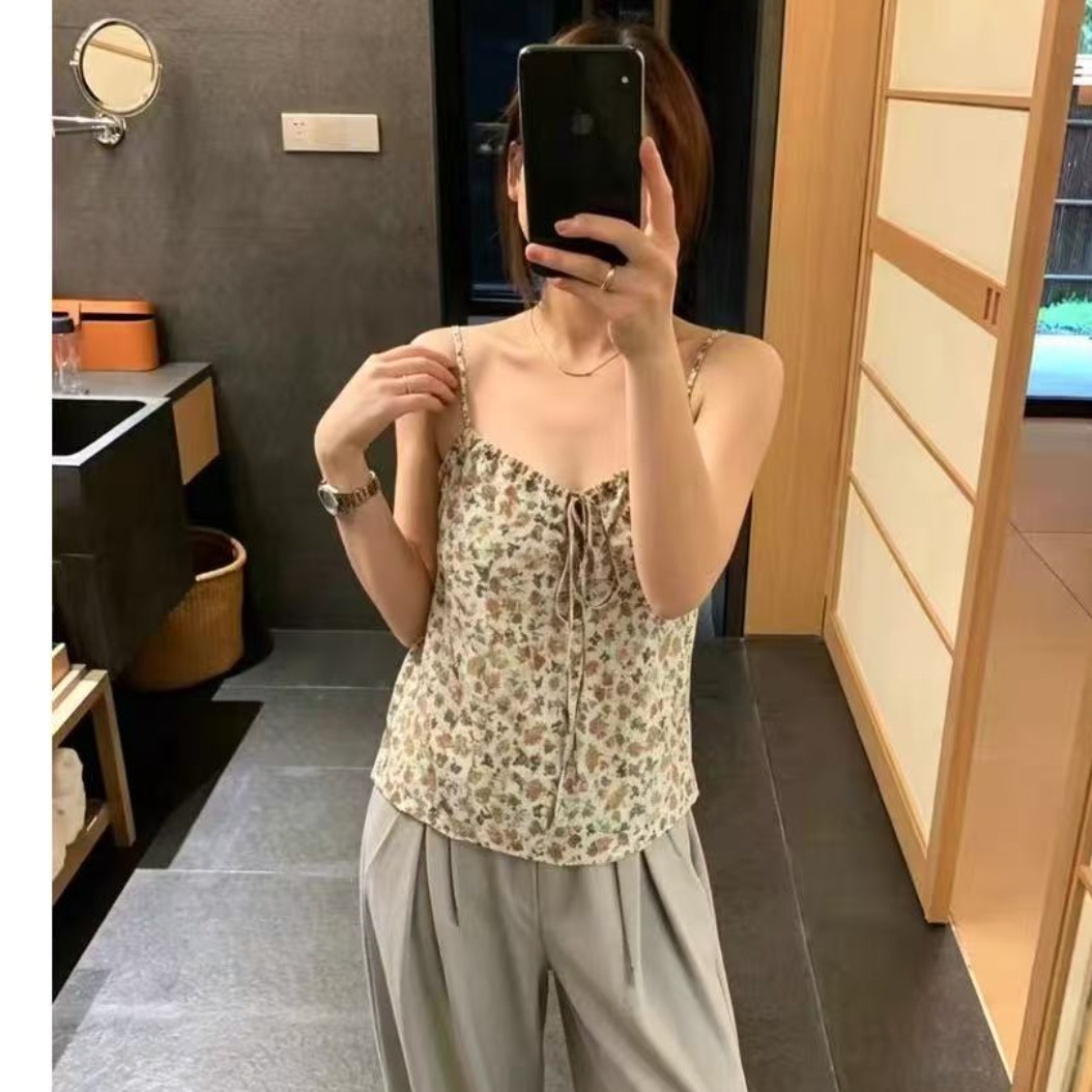 레트로 꽃무늬 홀로우 아웃 V넥 레이스업 민소매 캐미솔 여름 외출용 펌프 로프 나비 매듭 루즈핏 맨위