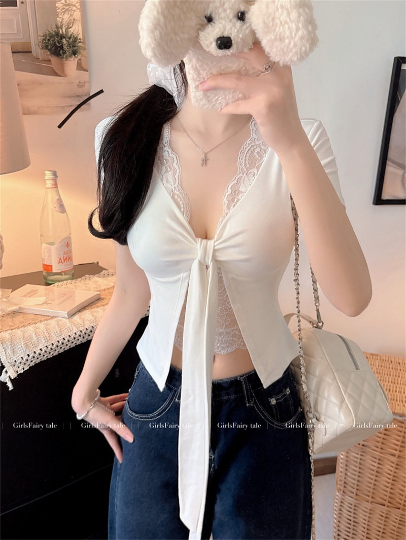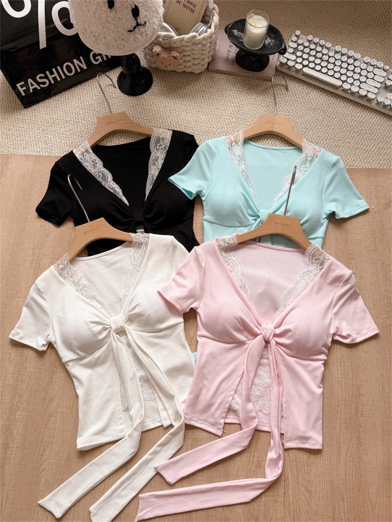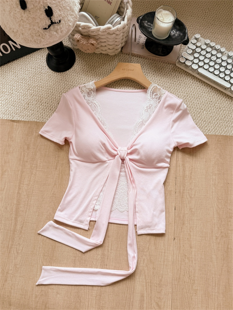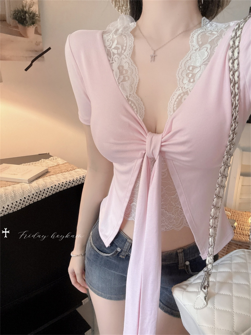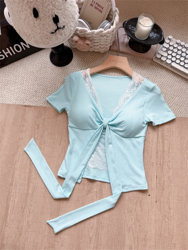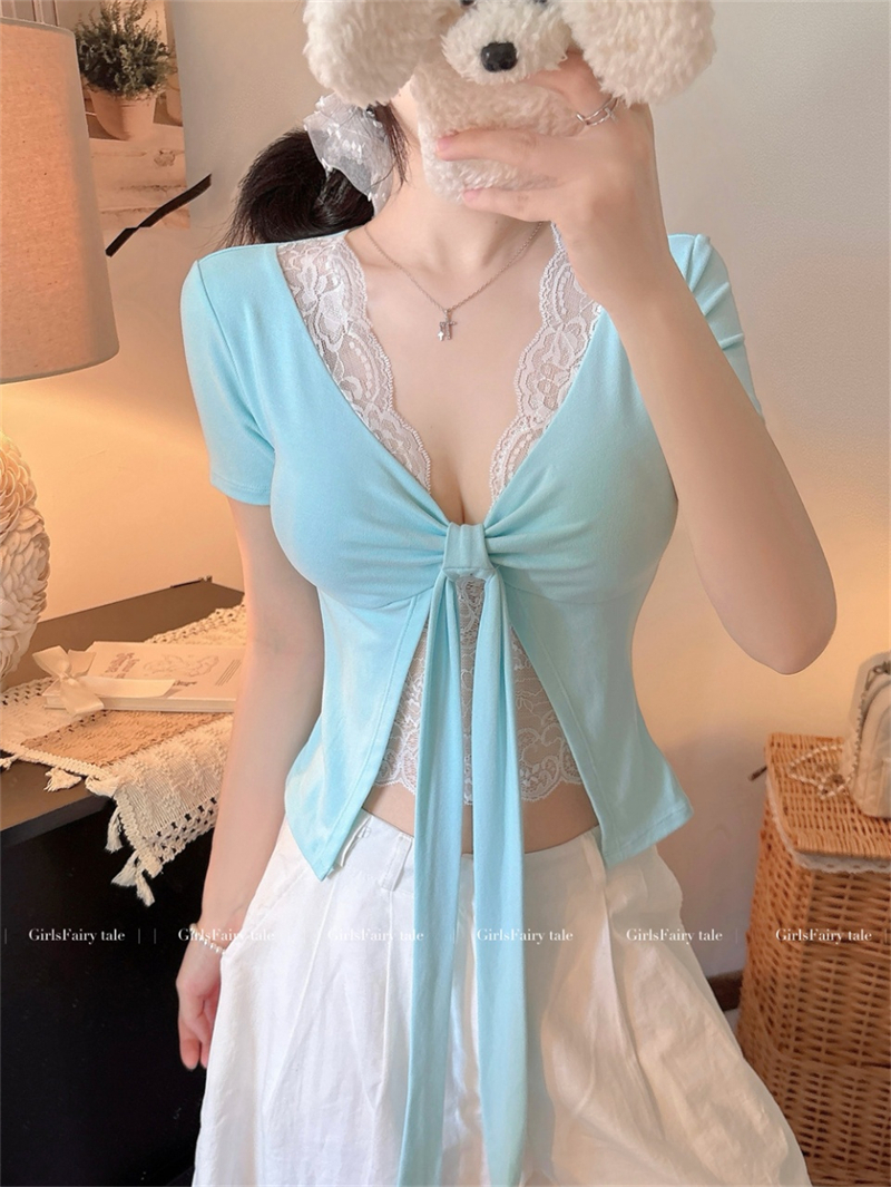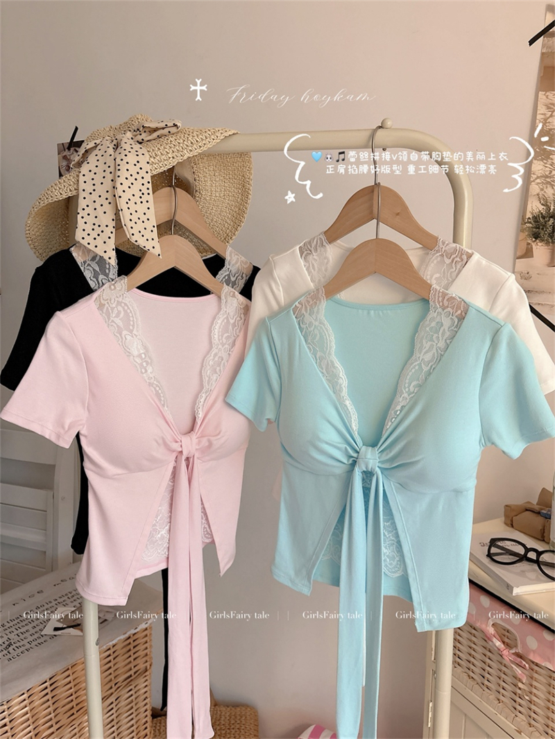 순수한 욕망 섹시함 레이스 측면 나비 넥타이 V넥 반팔 티셔츠 여성 여름 프랑스식 페이크 레이어드 벨트 가슴 패드 의류