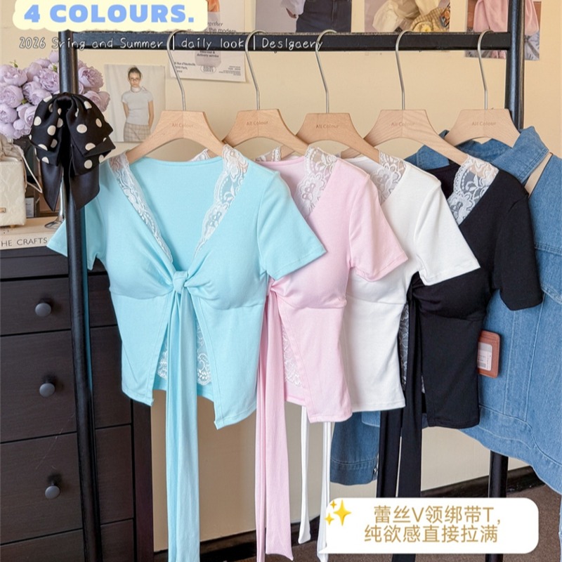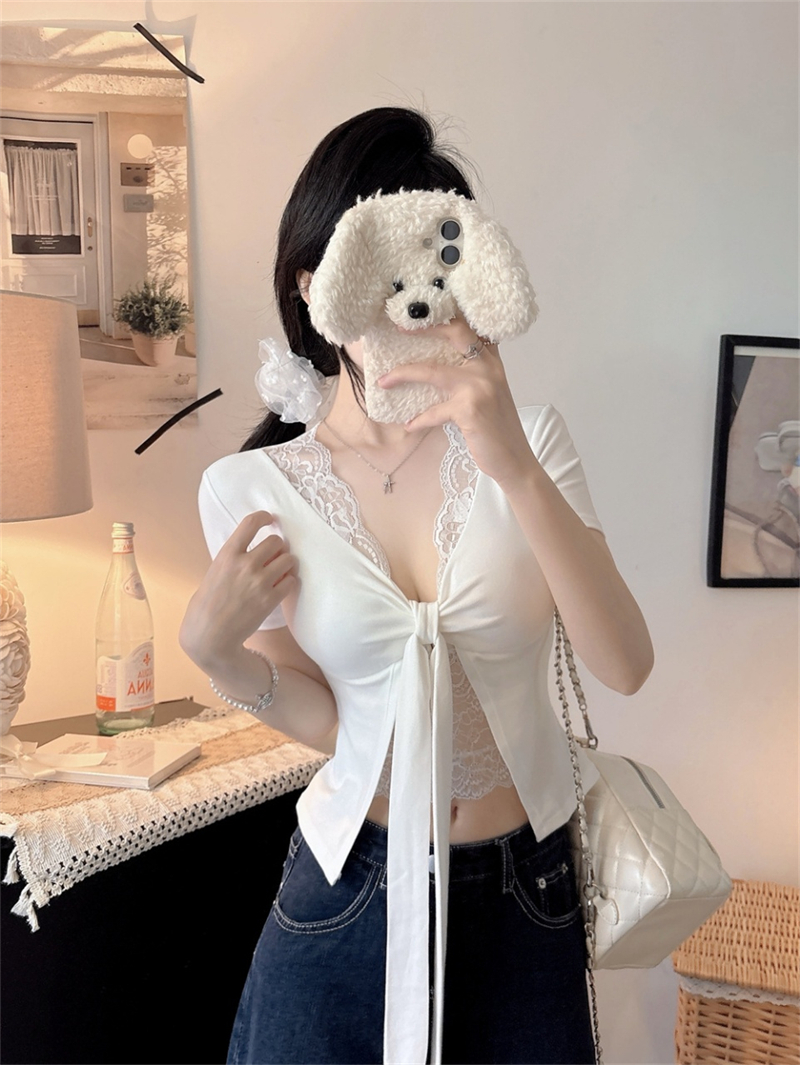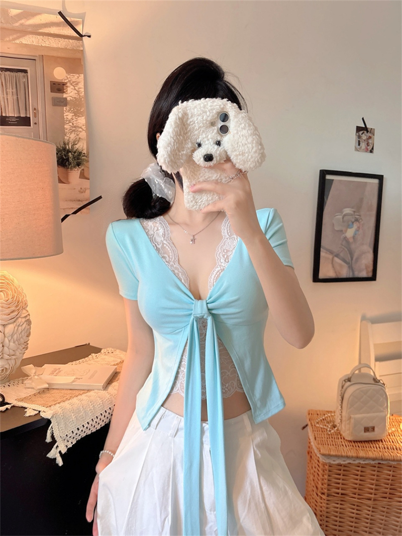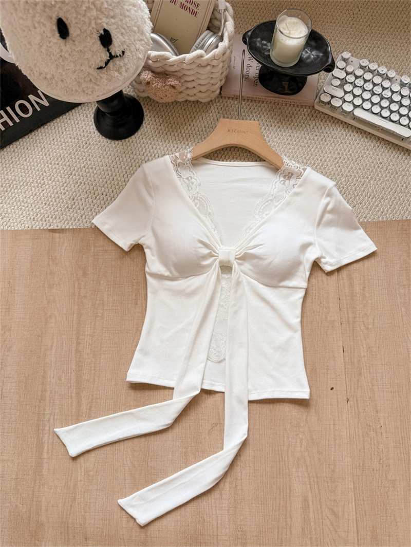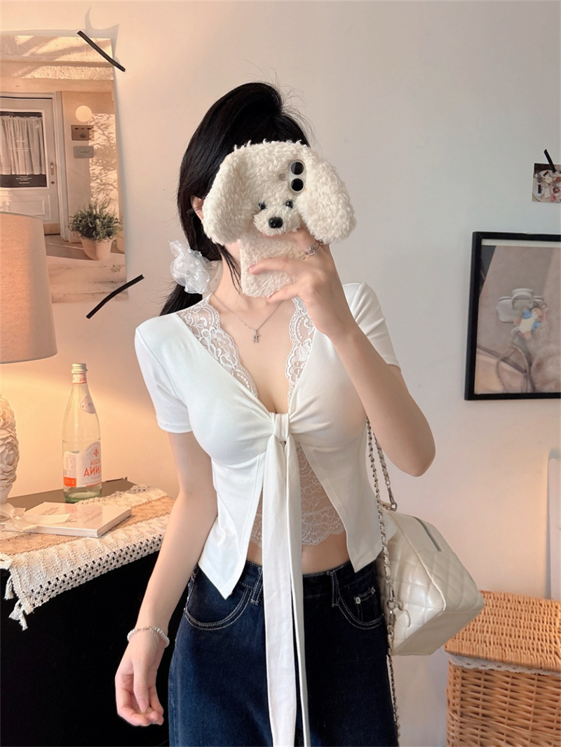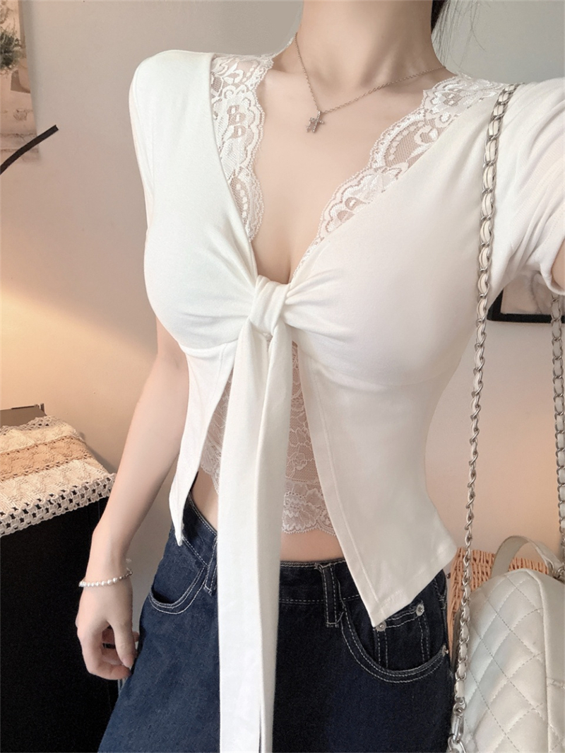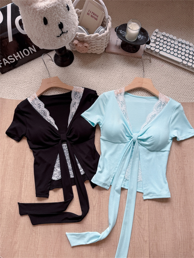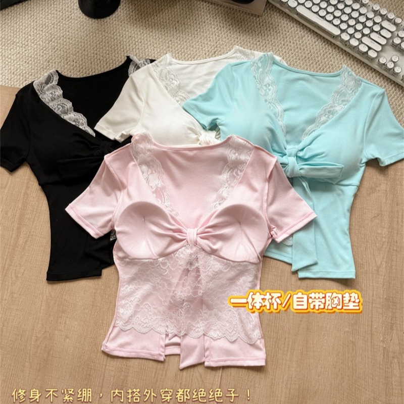 순수한 욕망 섹시함 레이스 측면 나비 넥타이 V넥 반팔 티셔츠 여성 여름 프랑스식 페이크 레이어드 벨트 가슴 패드 의류
