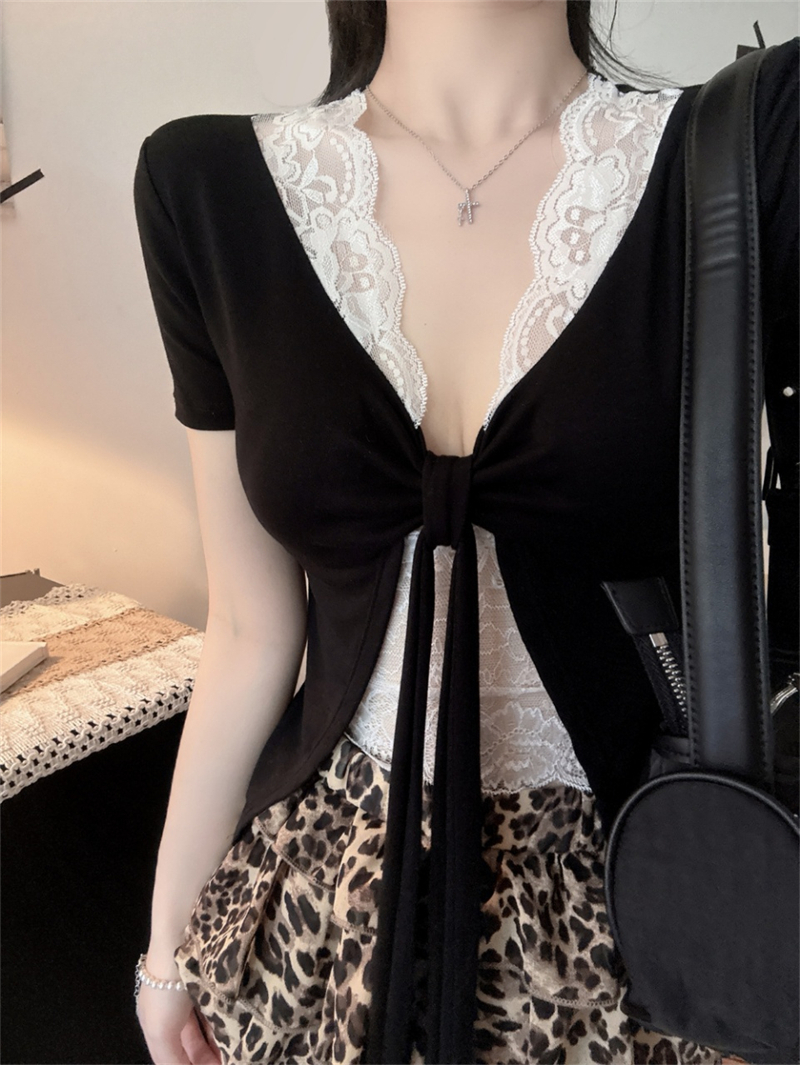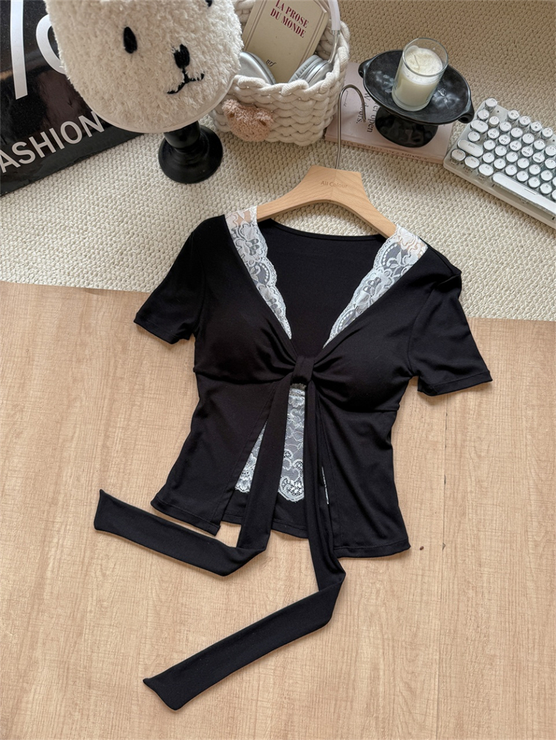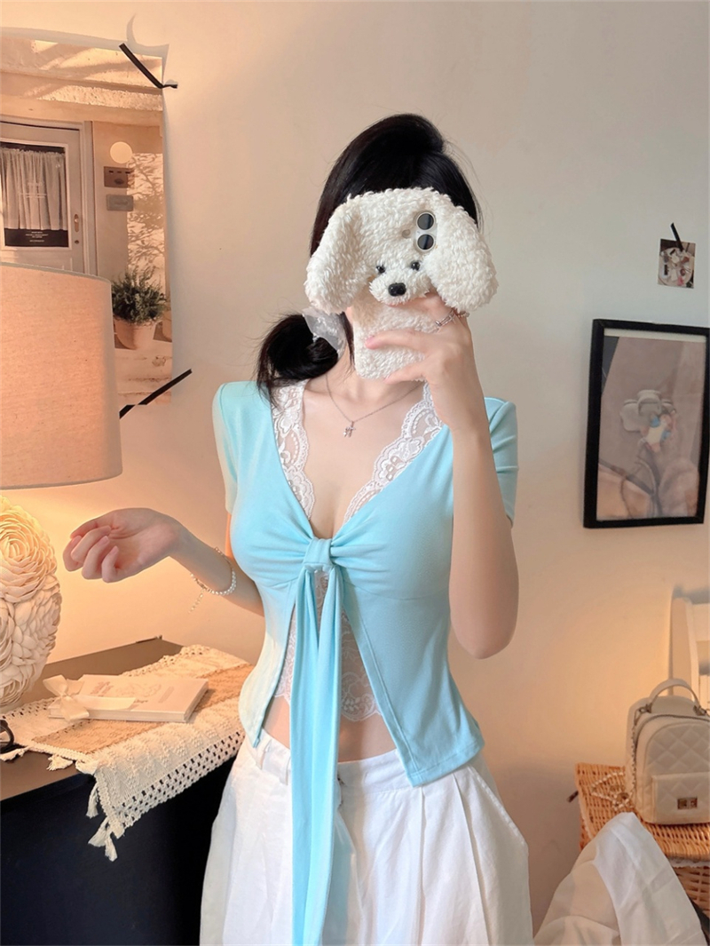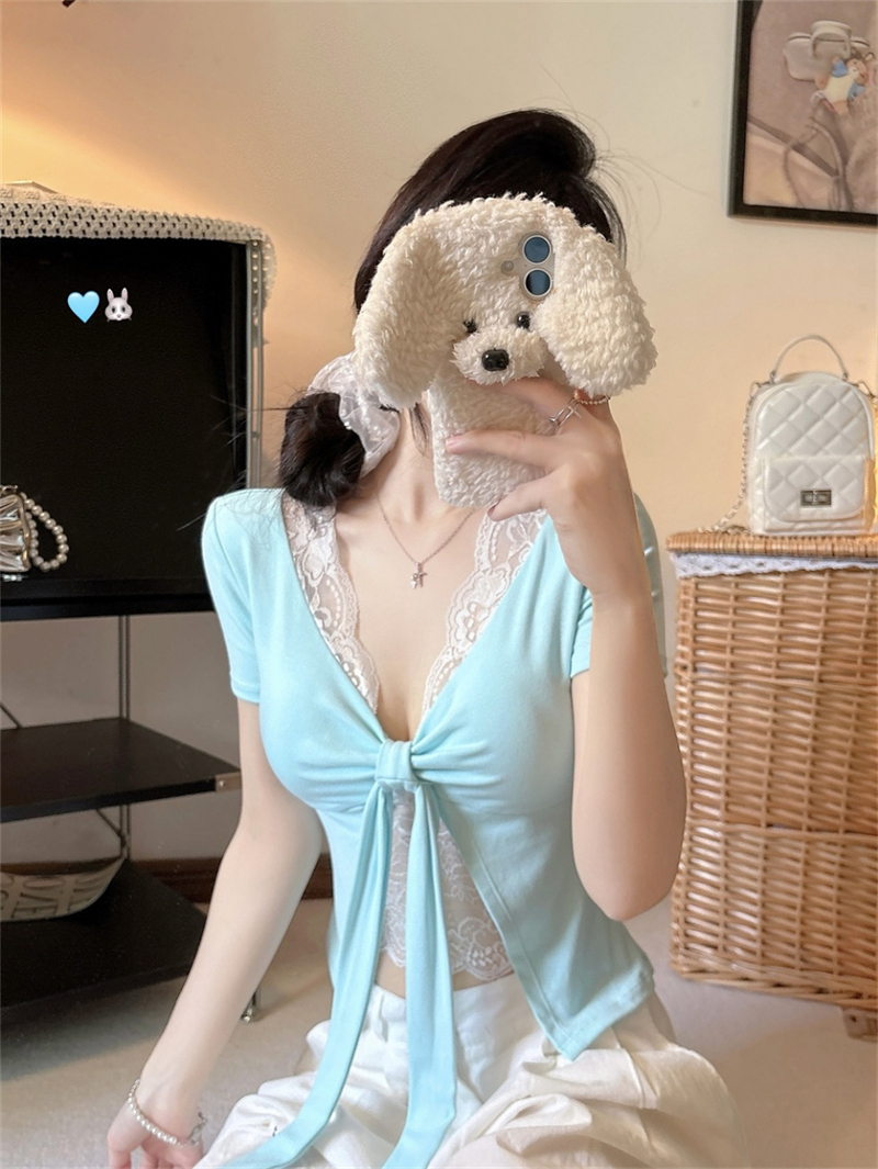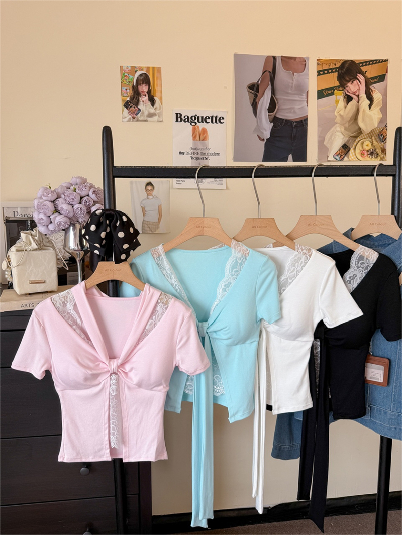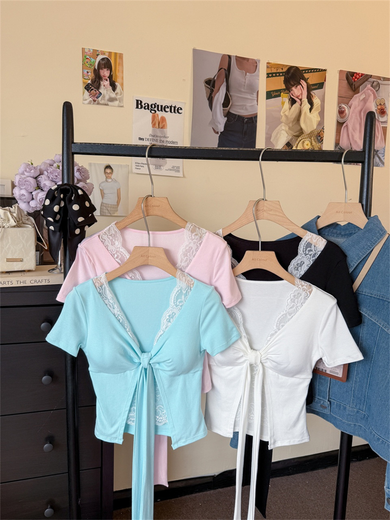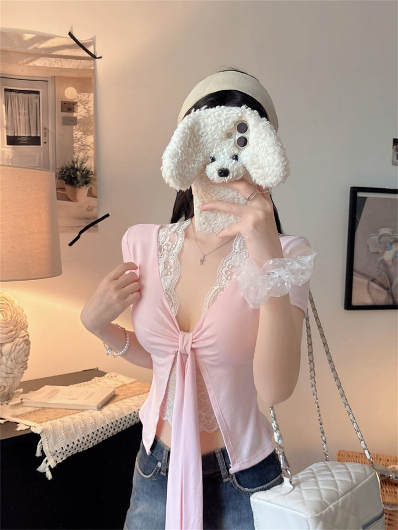 순수한 욕망 섹시함 레이스 측면 나비 넥타이 V넥 반팔 티셔츠 여성 여름 프랑스식 페이크 레이어드 벨트 가슴 패드 의류