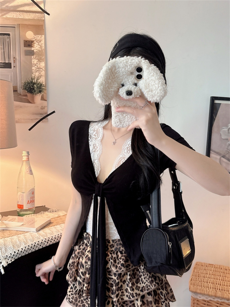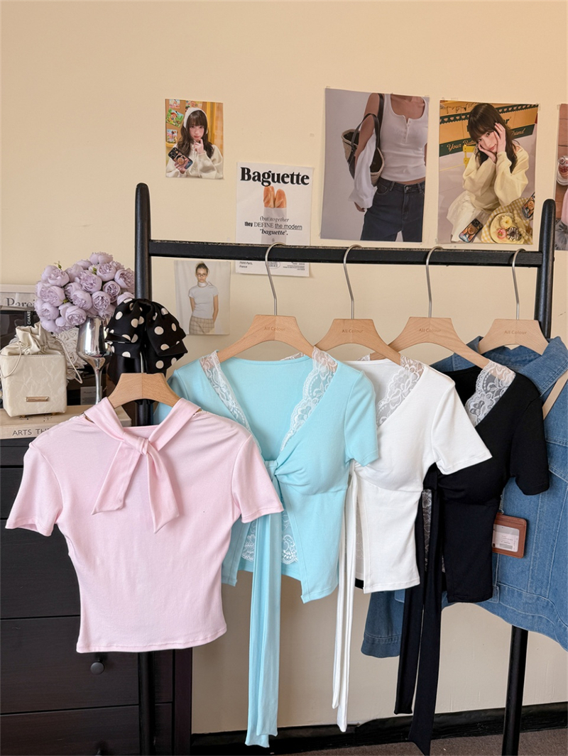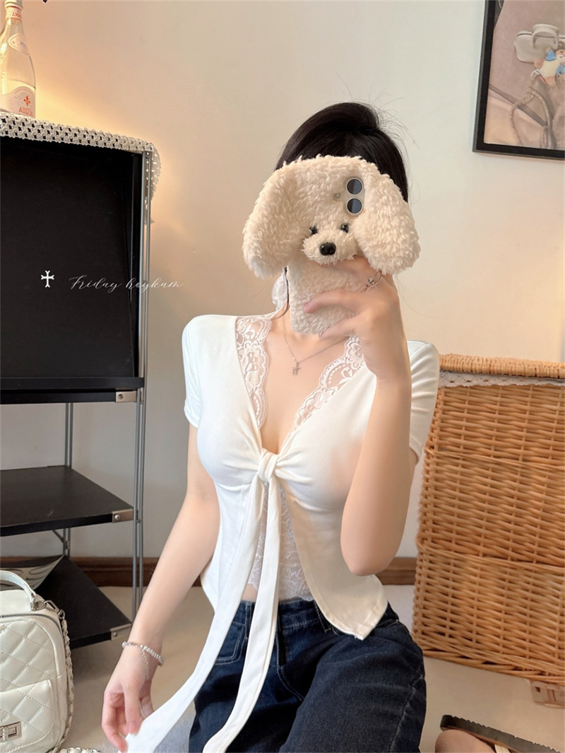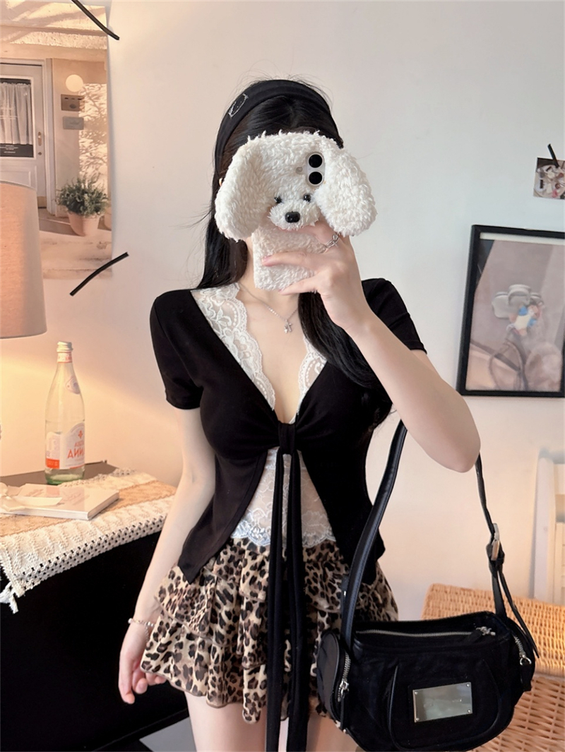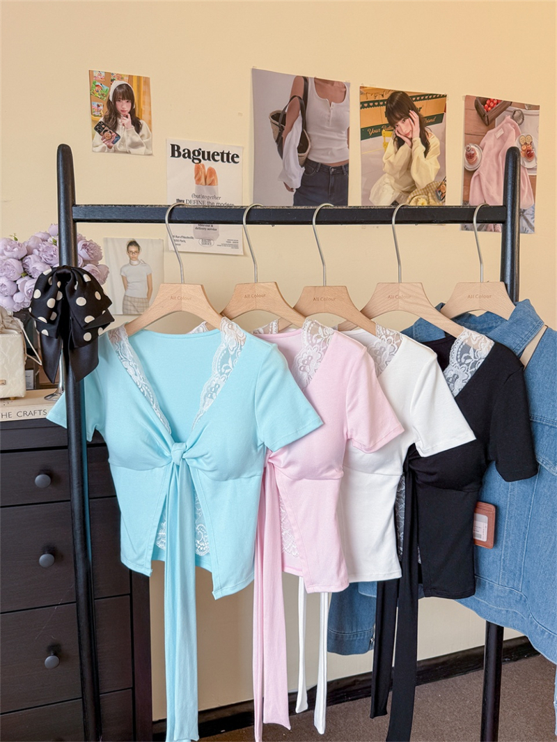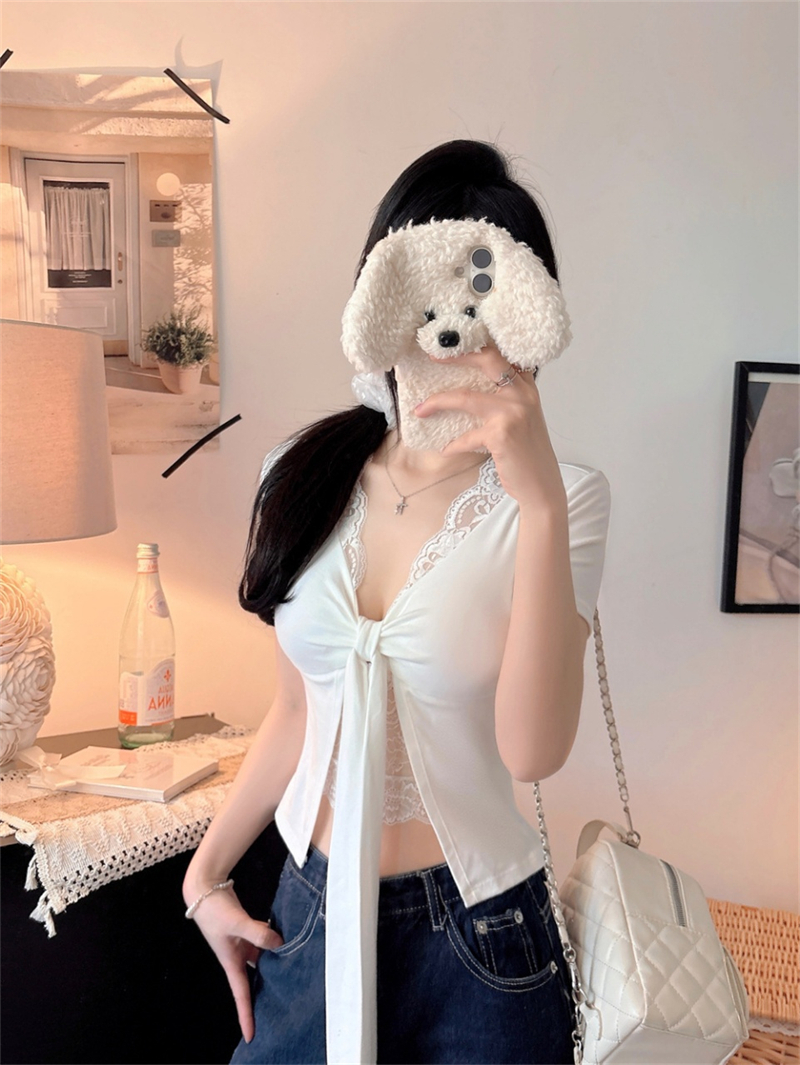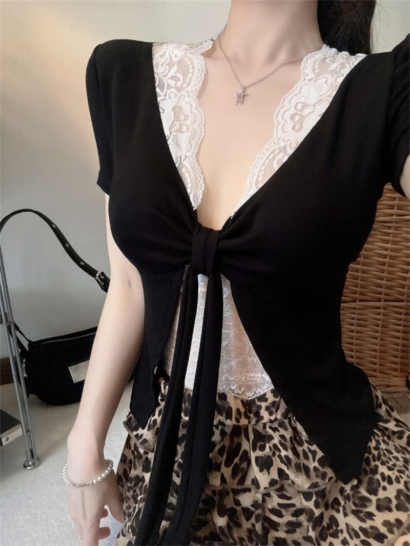 순수한 욕망 섹시함 레이스 측면 나비 넥타이 V넥 반팔 티셔츠 여성 여름 프랑스식 페이크 레이어드 벨트 가슴 패드 의류
