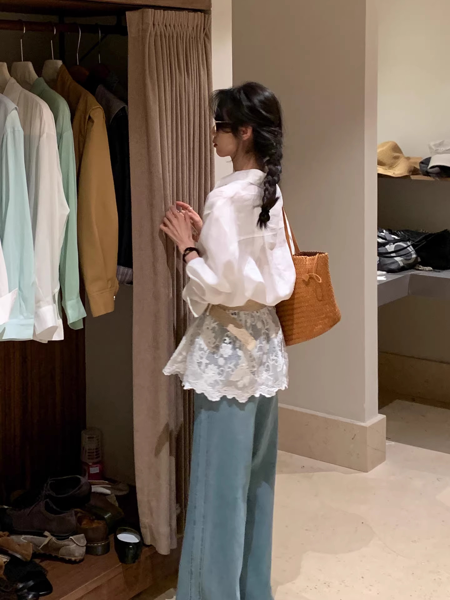 정가 재고 있음 프랑스식 순수한 욕망 바람 레이스 레이스 슬립 맨위 여성 하이웨이스트 도루 센스 넓은 다리 청바지 세트