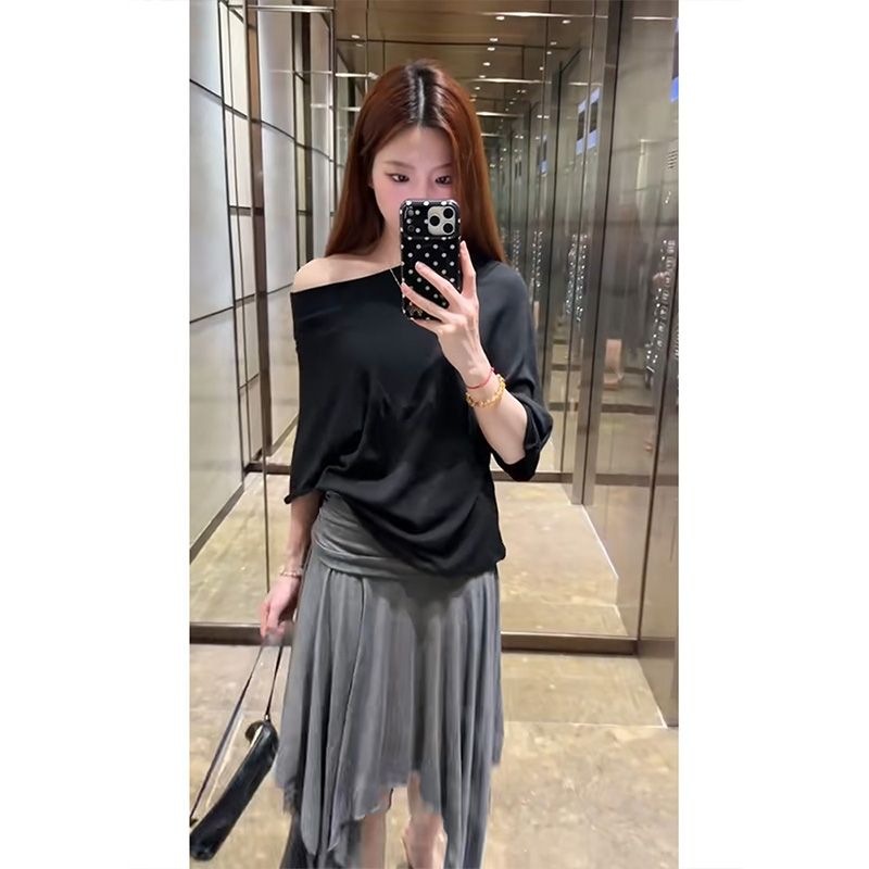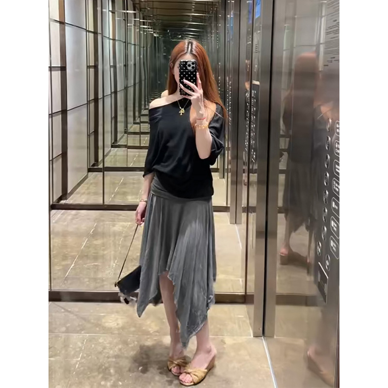 정가 재고 있음 한 부서 느긋한 바람 비스듬한 칼라 오프숄더 루즈핏 맨위 하이웨이스트 한 마디 불규칙 반신 치마 세트