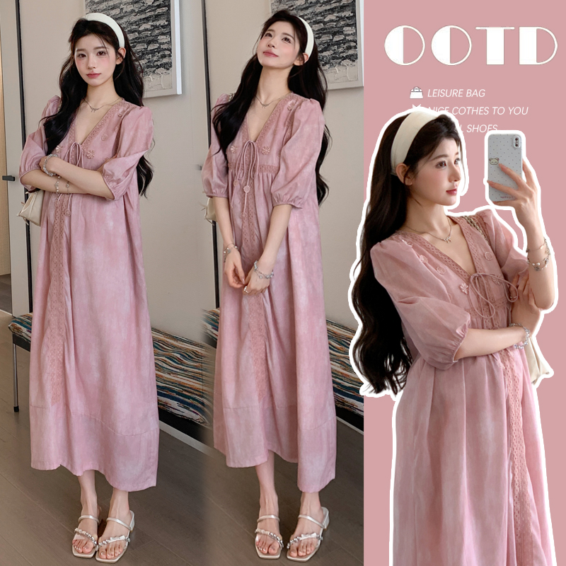 실사 지금 지금 높은 품질 얇은 스타일 차가운 센스 니트 임산부 여름 드레스 매운맛 엄마 몸매 가꾸기 V넥 임산부 드레스