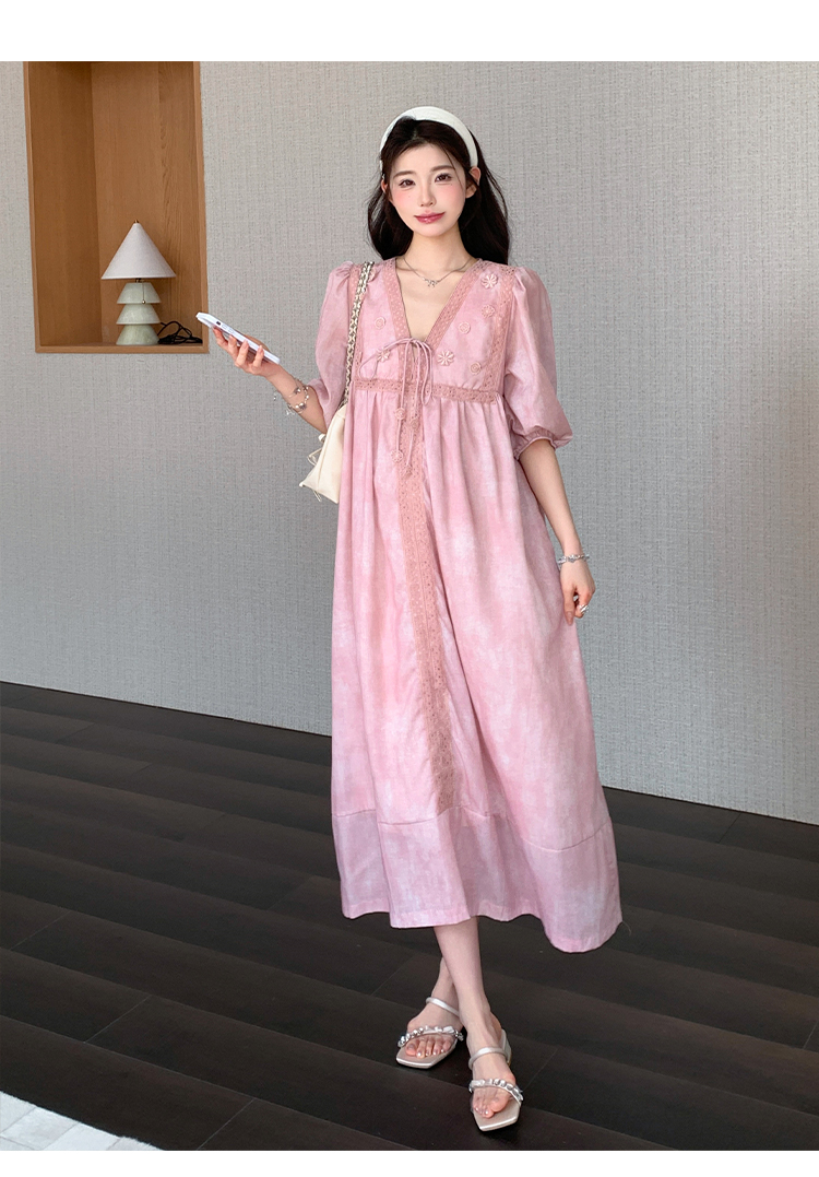 실사 지금 지금 여름 작은 키 출산 착용 한국 스타일 패션 몸매 가꾸기 슬림해 보이는 패치워크 자수 임산부 드레스