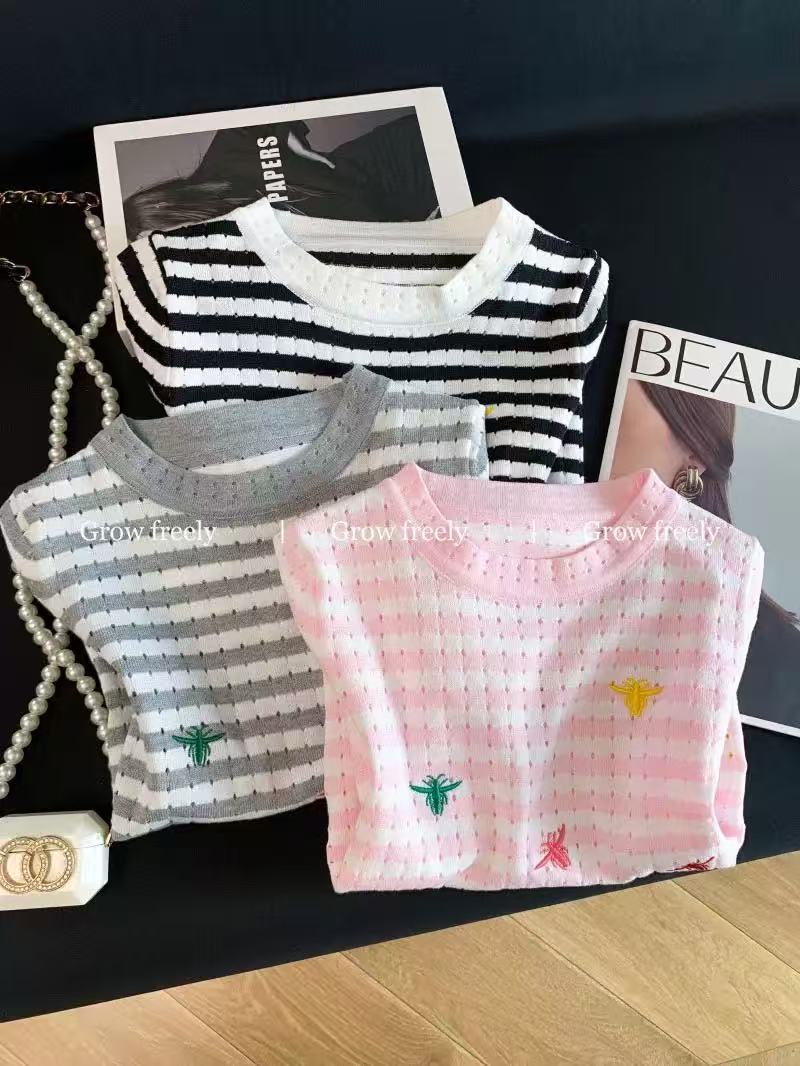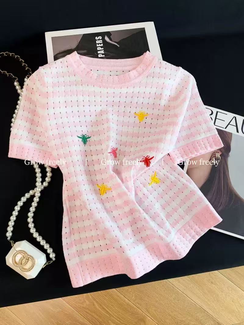 grow freely 핑크색 스트라이프 홀로우 아웃 니트 스웨터 반팔 여성 여름 얇은 스타일 슬림해 보이는 연령 감소 자수 맨위