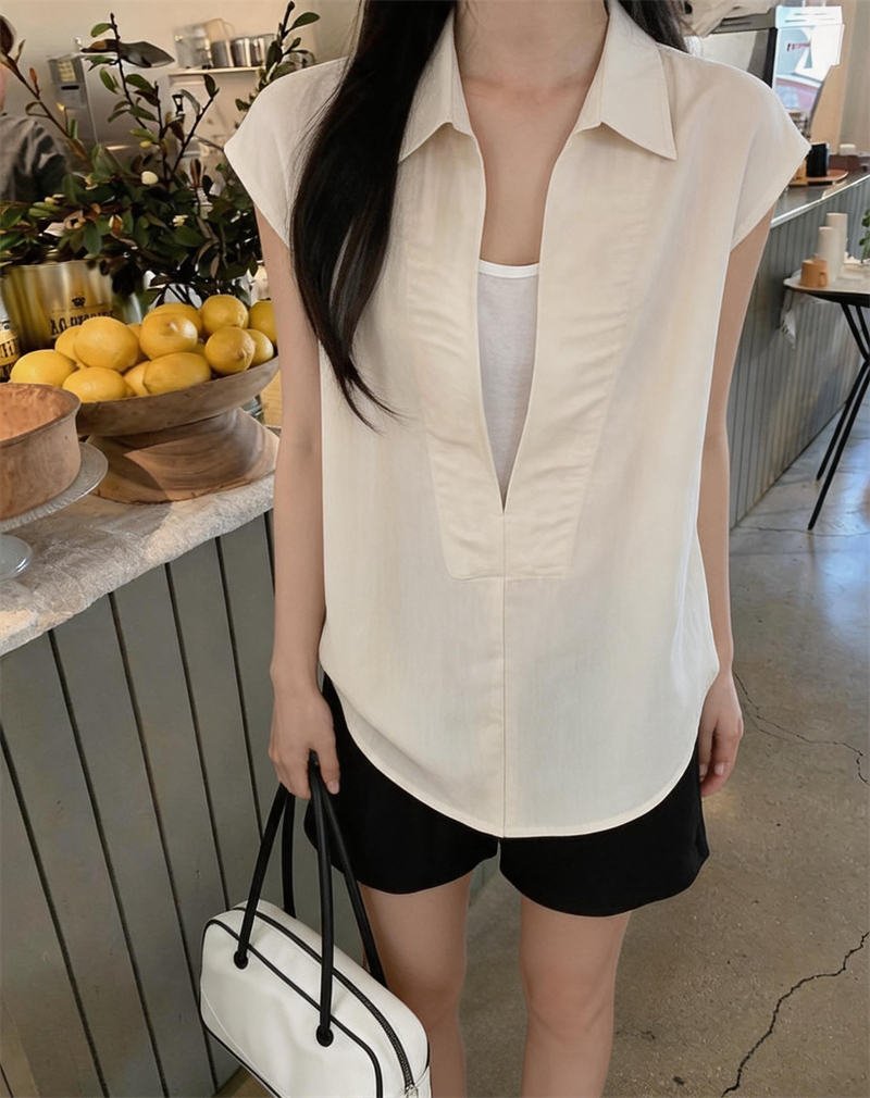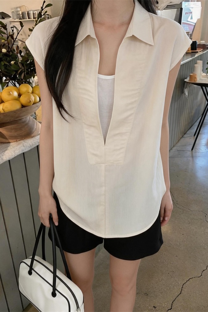 실사 새로운 나만의 것을 가져와 라. 착용 가져 가라. 센스 페이크 레이어드 폴로 칼라 어깨 민소매 셔츠 품격 슬림해 보이는 출퇴근 바람 여자 셔츠
