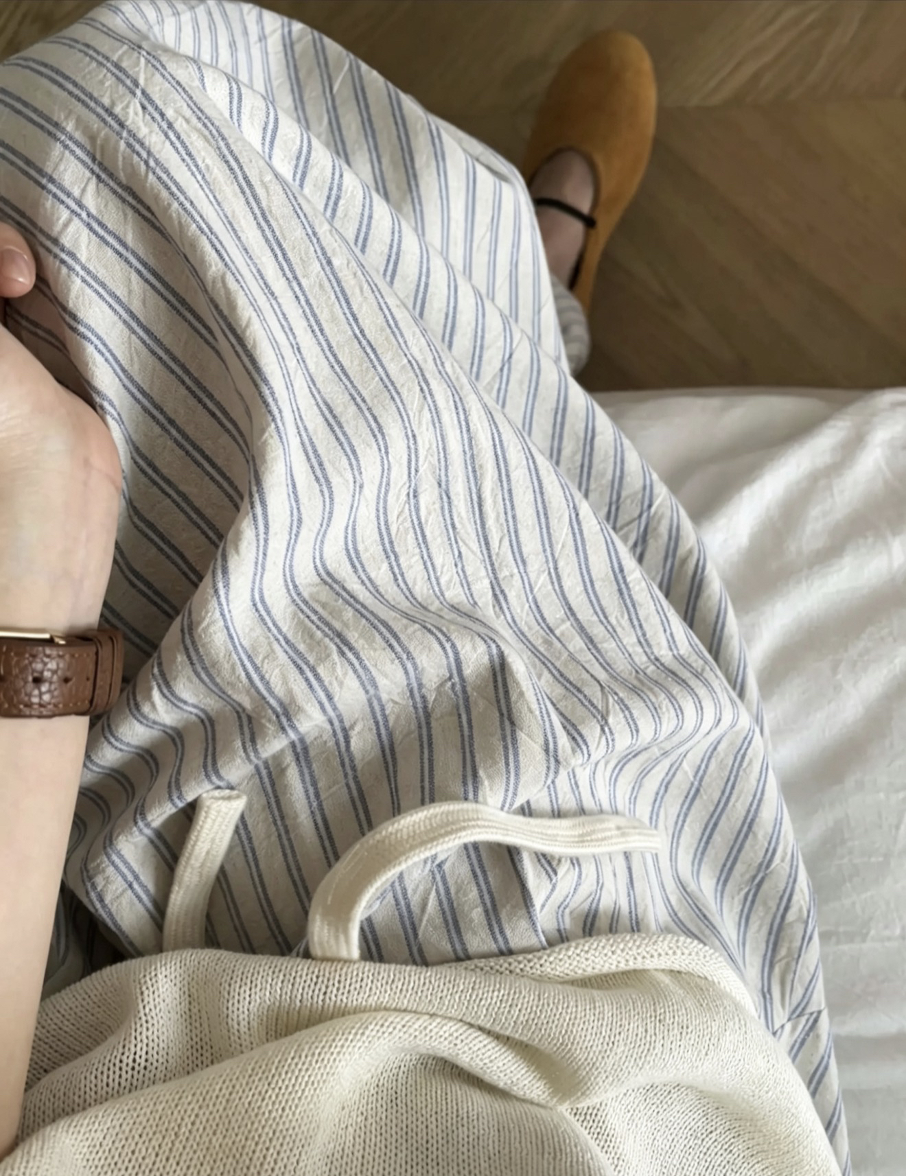 허리밴드 반신 스커트 한 부서 느긋한 바람 면 소재 세로 줄무늬 펌프 로프 봄 여름 쌀 회색 블루 스트라이프