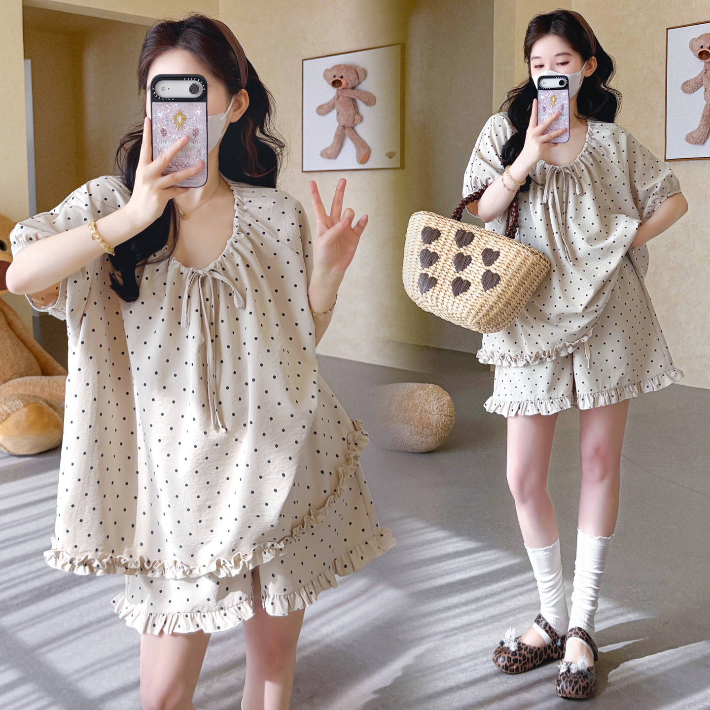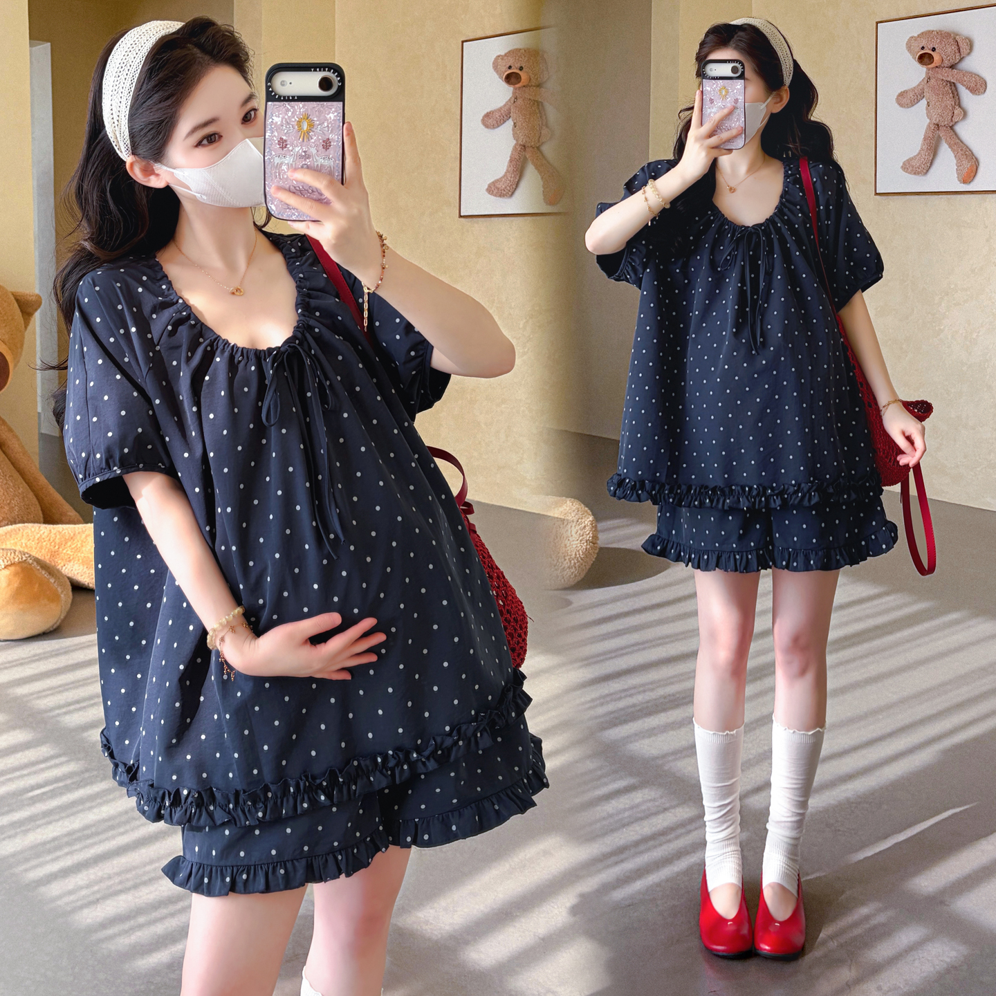 지금 실사 여름 새로운 임산부 도트 무늬 펌프 로프 프릴 맨위 임산부 수 있습니다. 조정 반바지 세트