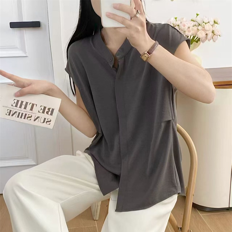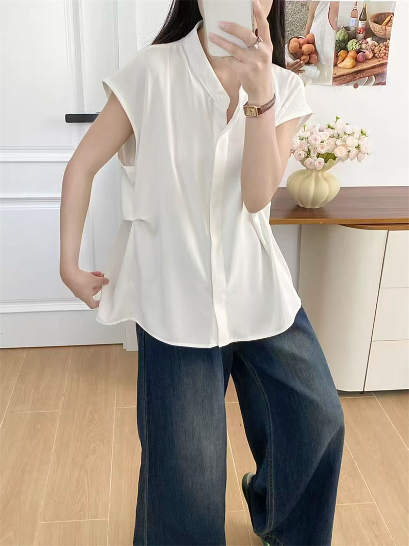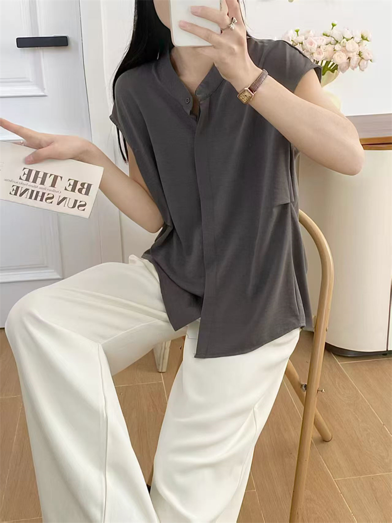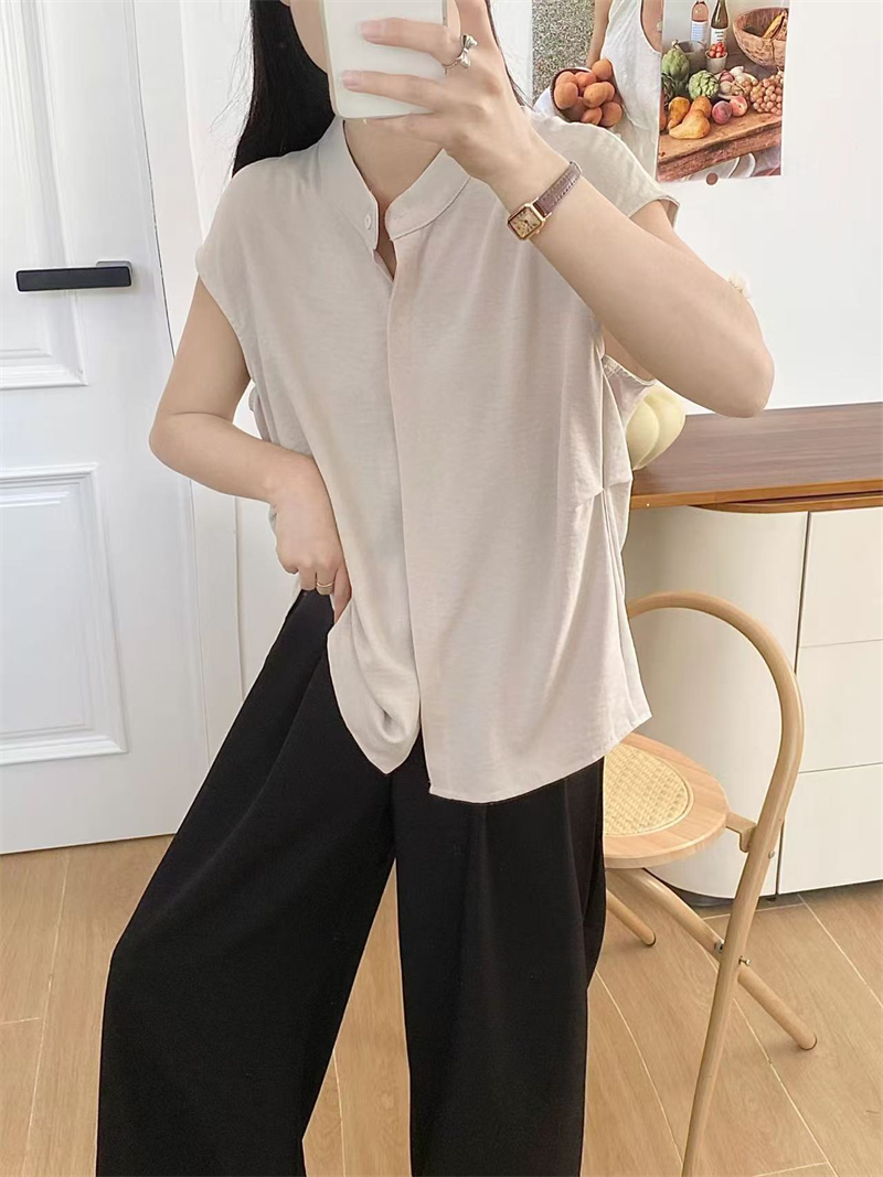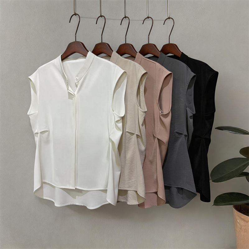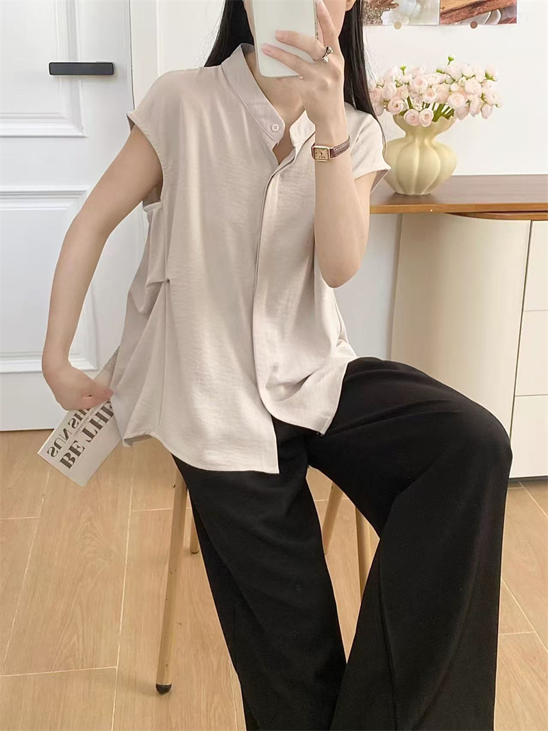 실사 새로운 패션 개성 디자인 캐주얼 다용도 스탠드 칼라 민소매 셔츠 품격 슬림해 보이는 출퇴근 바람 여자 셔츠