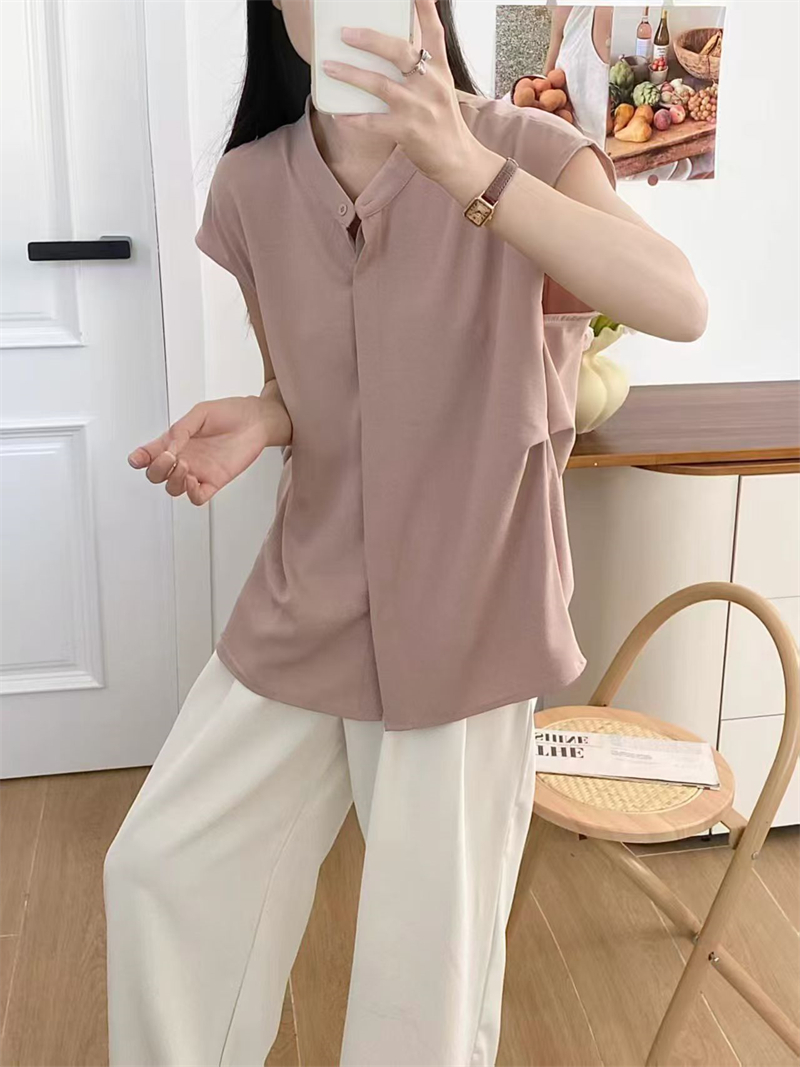 실사 단색 미니멀리즘 주름 캐주얼 출퇴근 반팔 여성 셔츠 새로운 작은 대중 표지 고기 슬림해 보이는 몸매 가꾸기 맨위