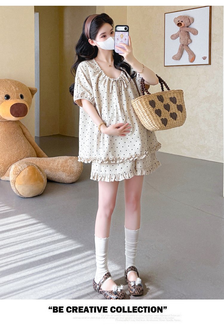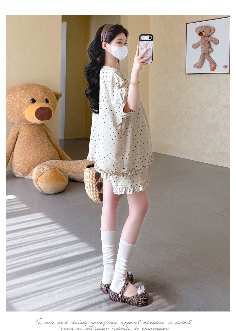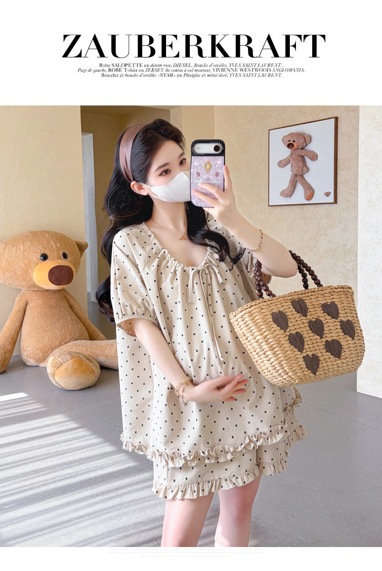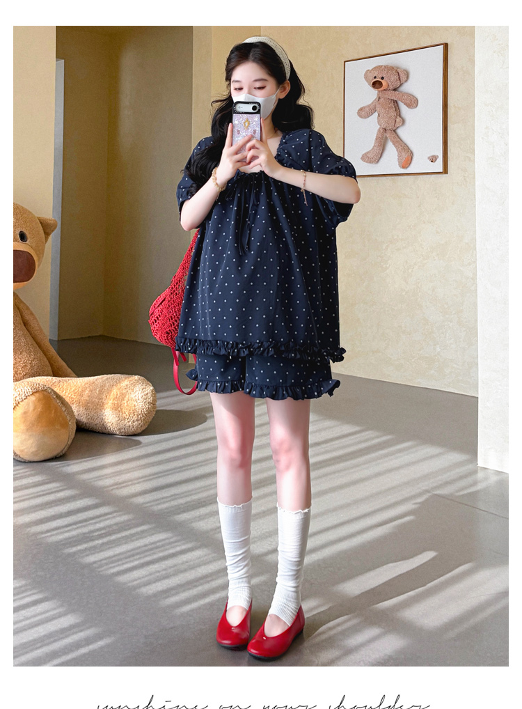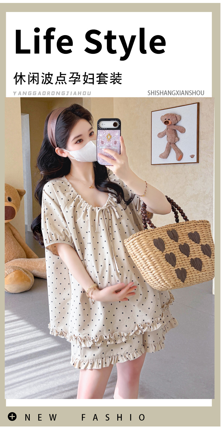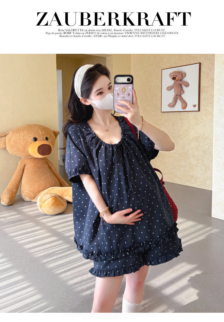 지금 실사 여름 새로운 임산부 도트 무늬 펌프 로프 프릴 맨위 임산부 수 있습니다. 조정 반바지 세트