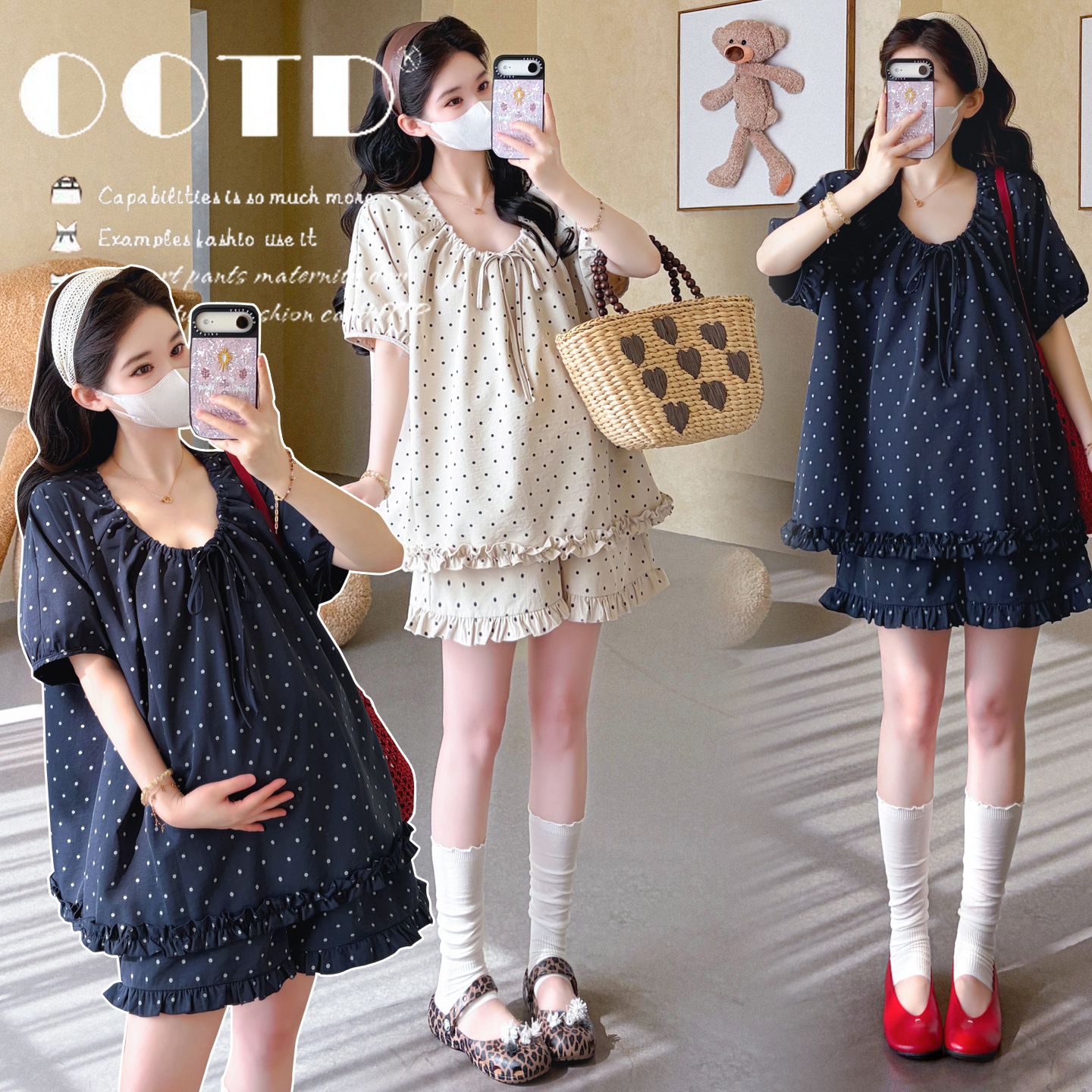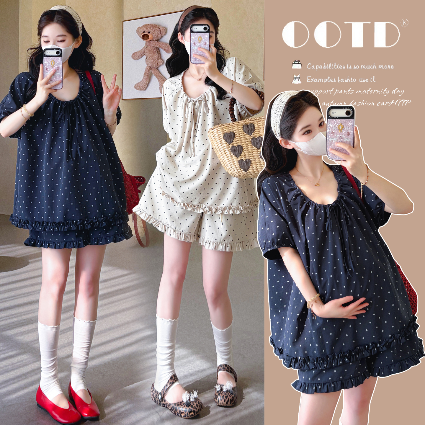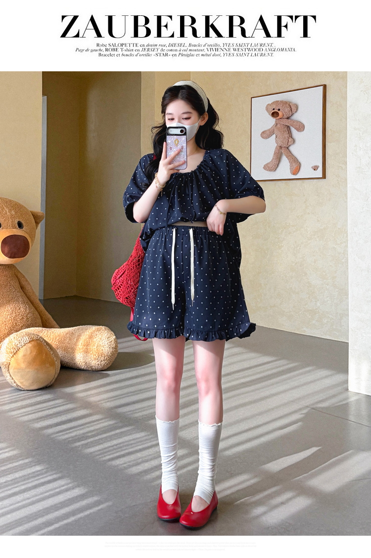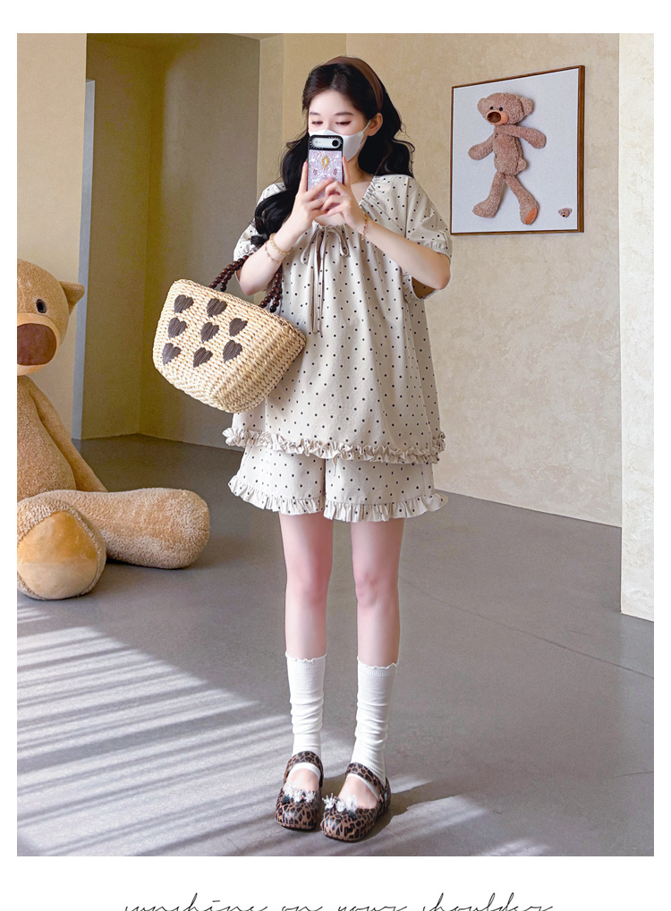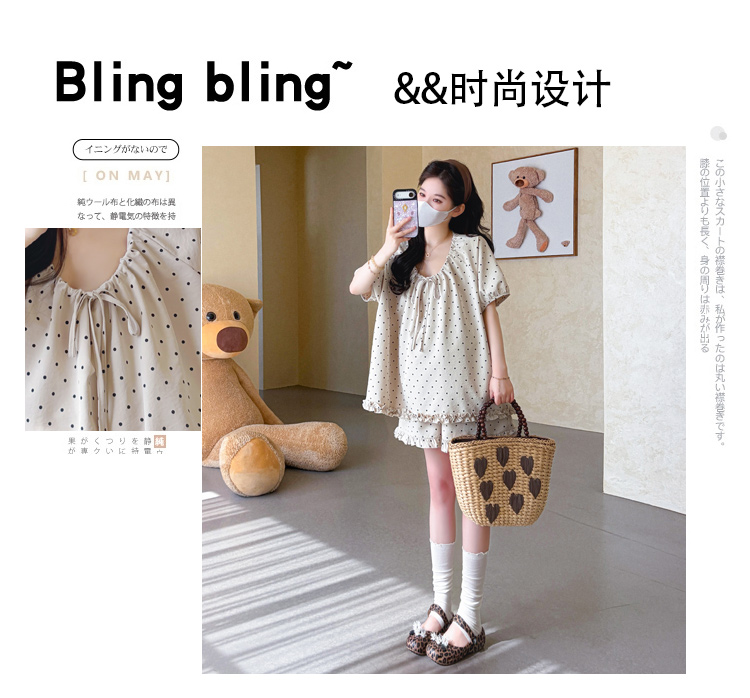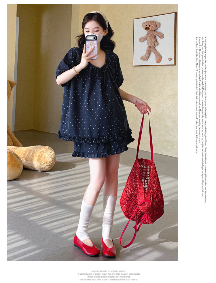 지금 실사 여름 새로운 임산부 도트 무늬 펌프 로프 프릴 맨위 임산부 수 있습니다. 조정 반바지 세트