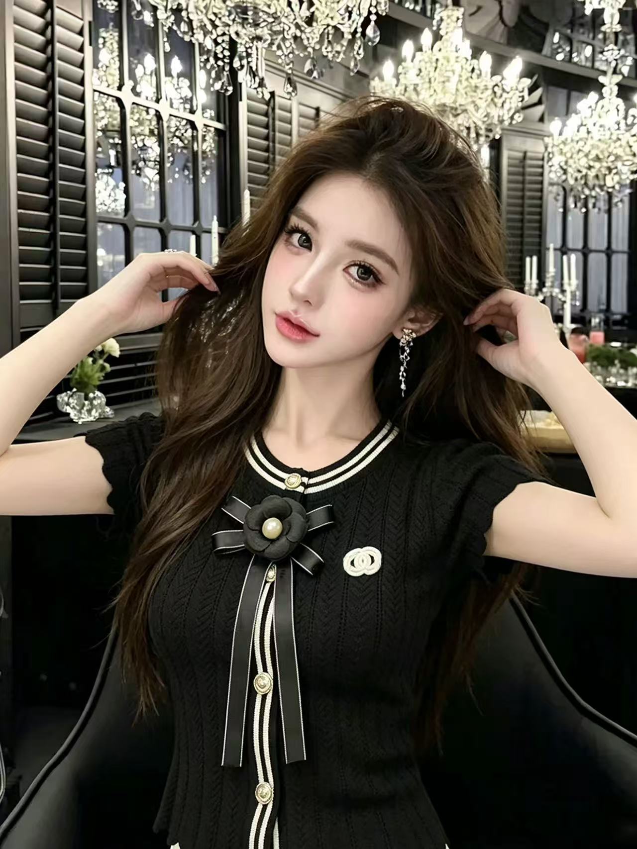 lym studio 검정색 반팔 티셔츠 여성 나비 매듭 진주 장식 몸매 가꾸기 슬림해 보이는 품격 맨위 트렌디