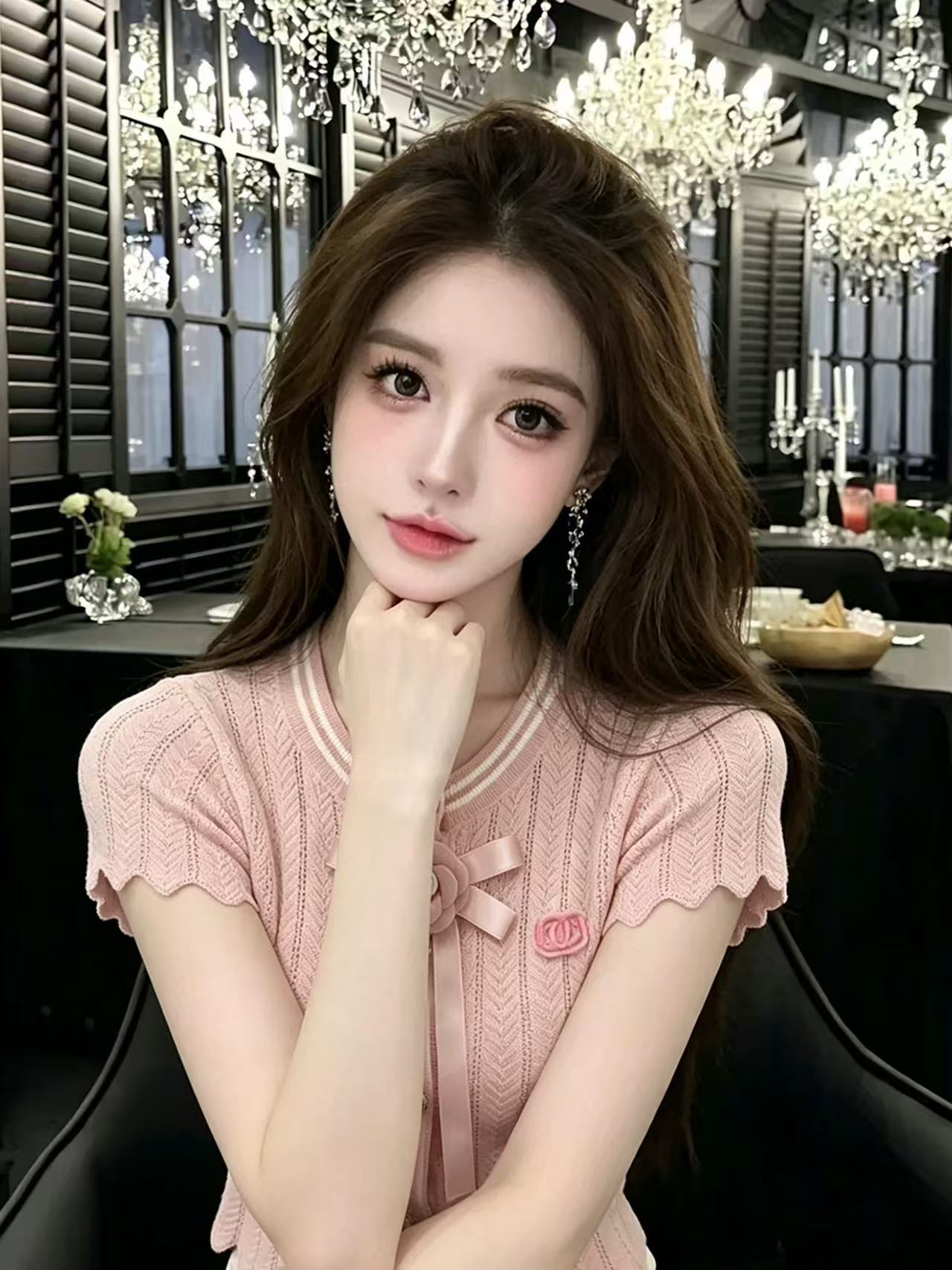 grow freely 핑크색 스트라이프 홀로우 아웃 니트 스웨터 반팔 여성 여름 얇은 스타일 슬림해 보이는 연령 감소 자수 맨위
