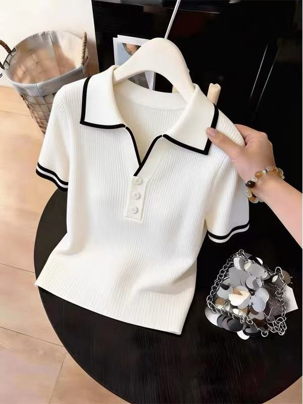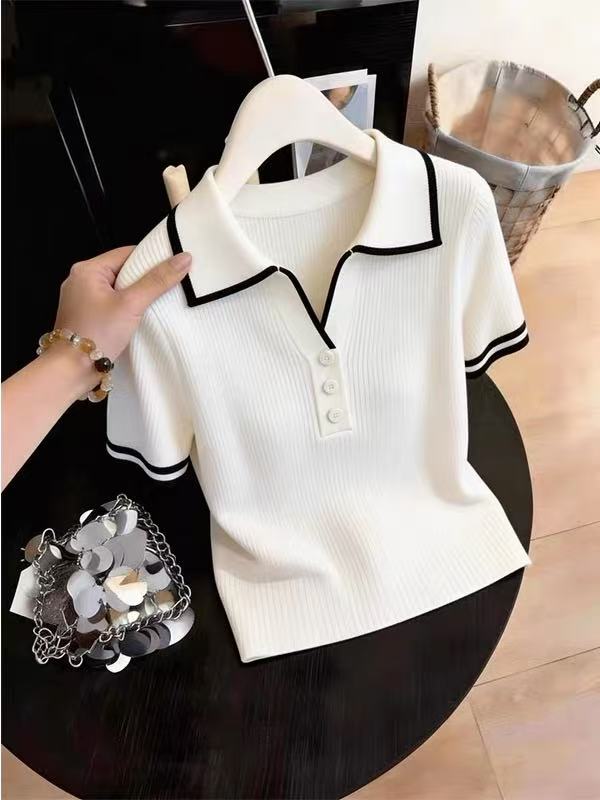 화이트 POLO 칼라 니트 반팔 여성 2026 새로운 여름 배색 구덩이 기사 슬림해 보이는 품격 다용도 쇼트 스타일 맨위
