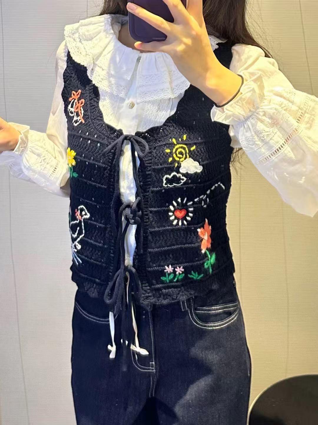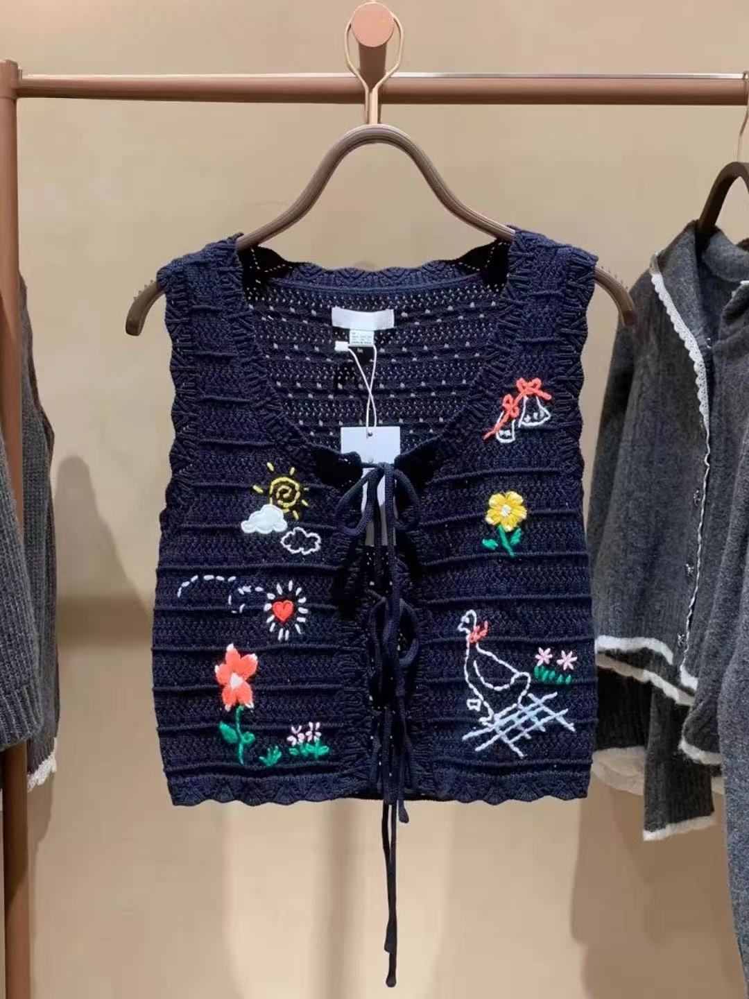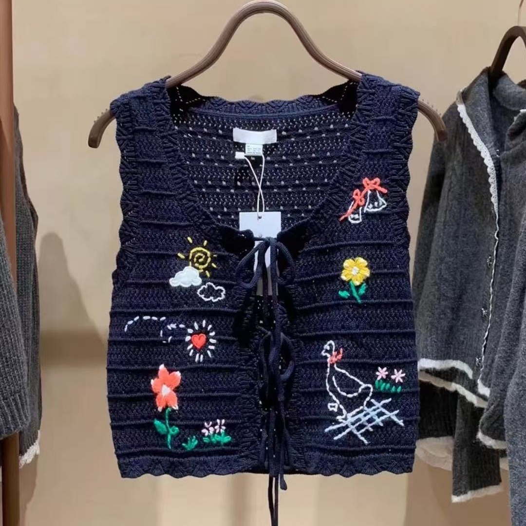 2026 봄 새로운 낭만주의 전원 바람 이자 자수 홀로우 아웃 민소매 스택 착용 니트 오픈 가디건 베스트 조끼 여성