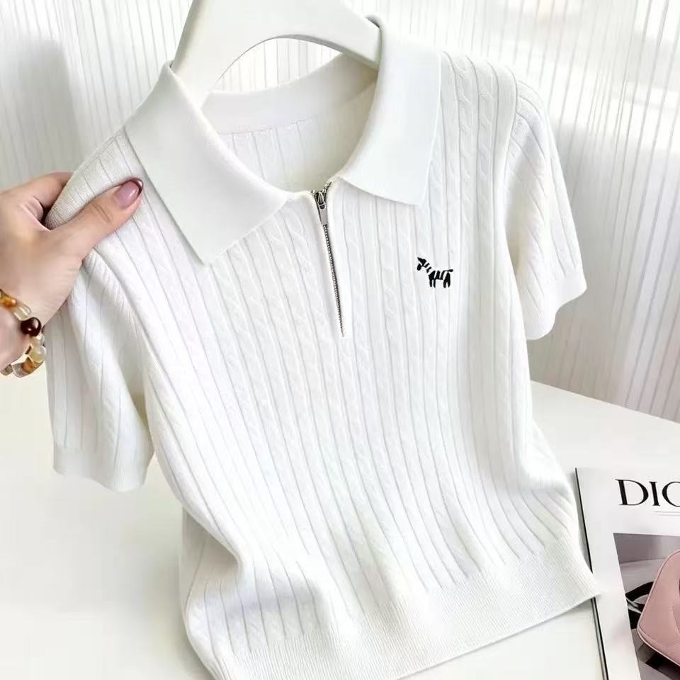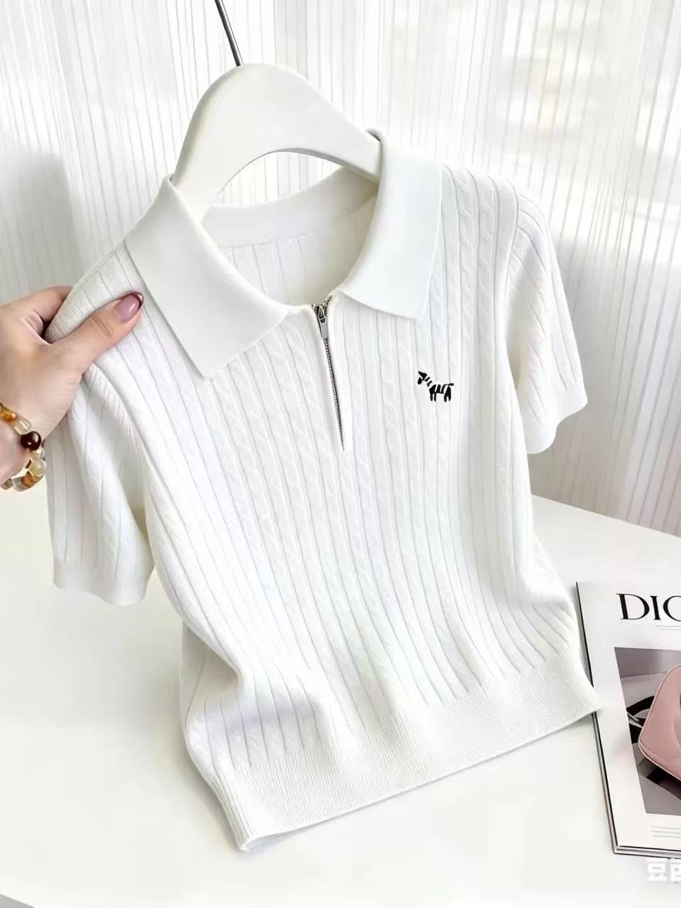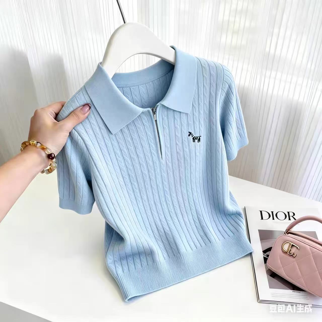 미니멀리즘 POLO 칼라 꽈배기 니트 스웨터 빅 사이즈 지방 mm 여성 여름 새로운 반팔 하프 지퍼 품격 캐주얼 맨위