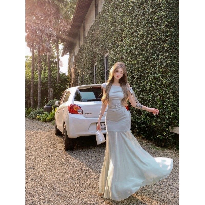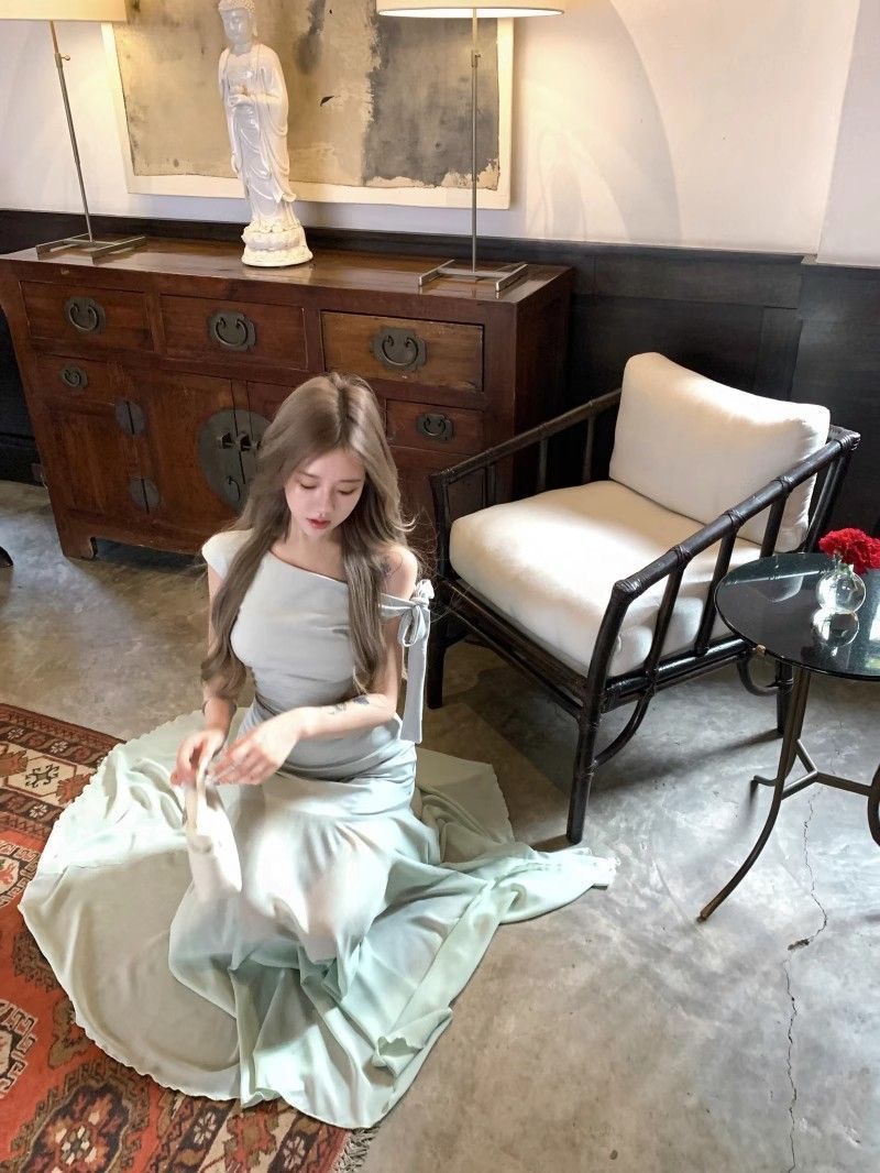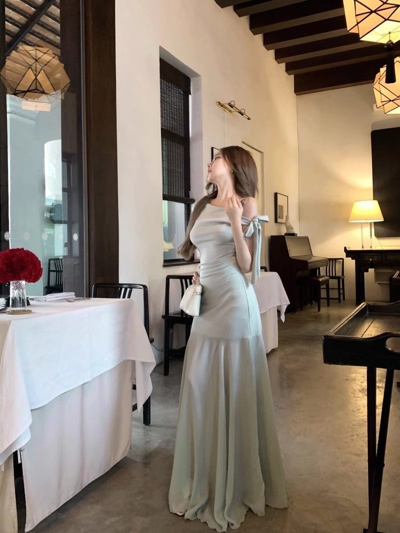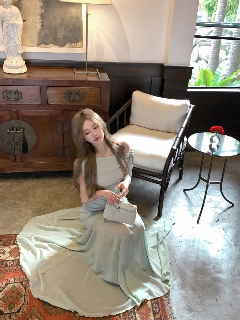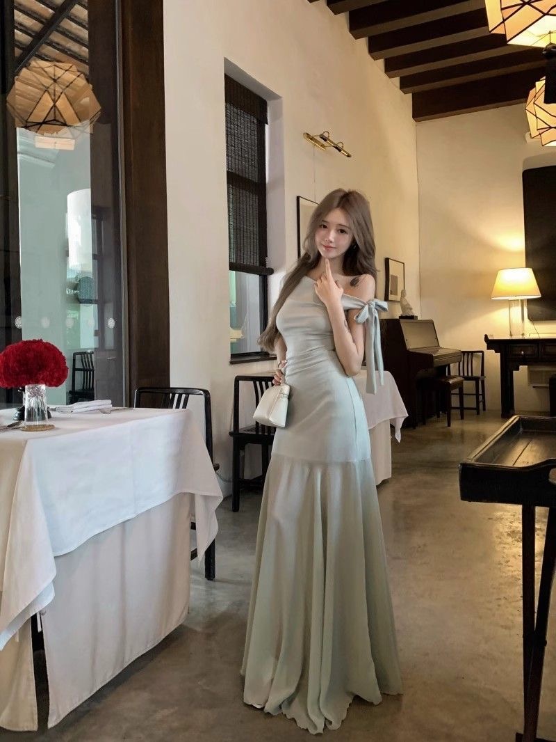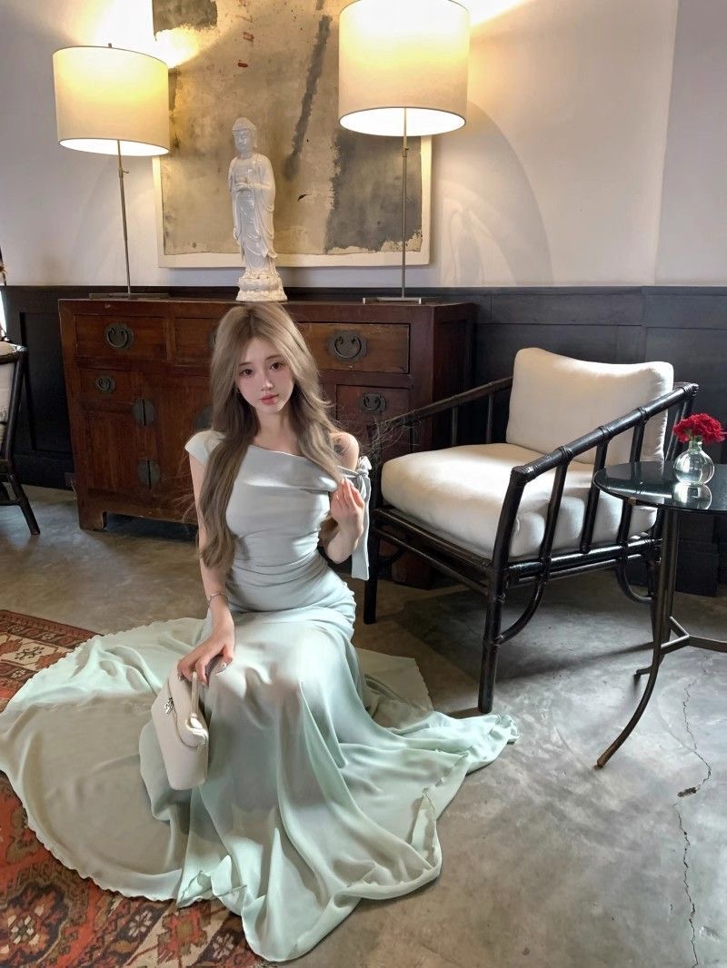 2026 여름 새로운 프랑스식 박하 녹색 튜브탑 드레스 아이들 해변가 휴가 바람 허리 수축 오프숄더 롱 스커트