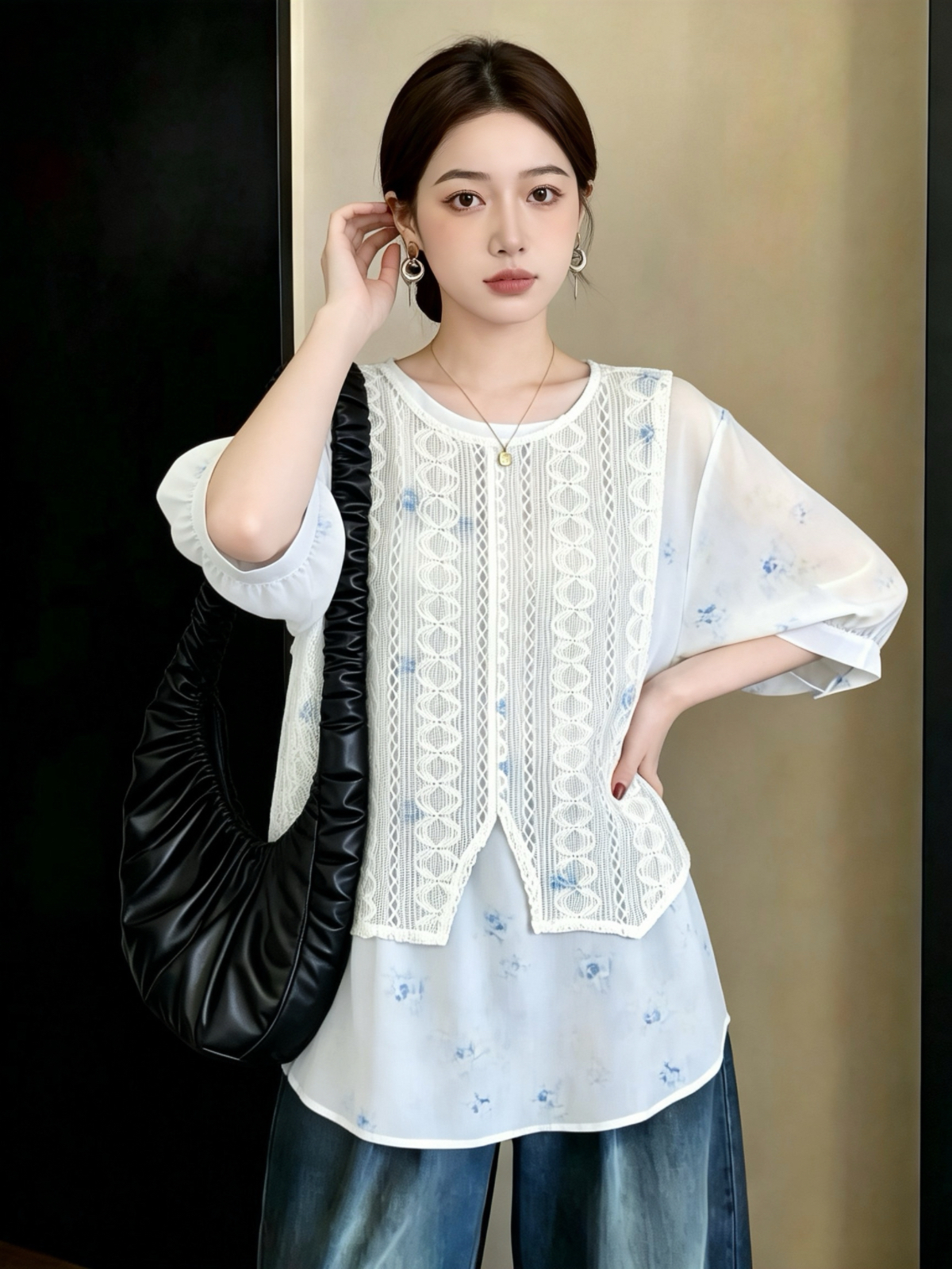 실사 빅 사이즈 지방 mm 자수 레이스 루즈핏 슬림해 보이는 7부 소매 레이스 다용도 루즈핏 면 소재 풀오버 맨위