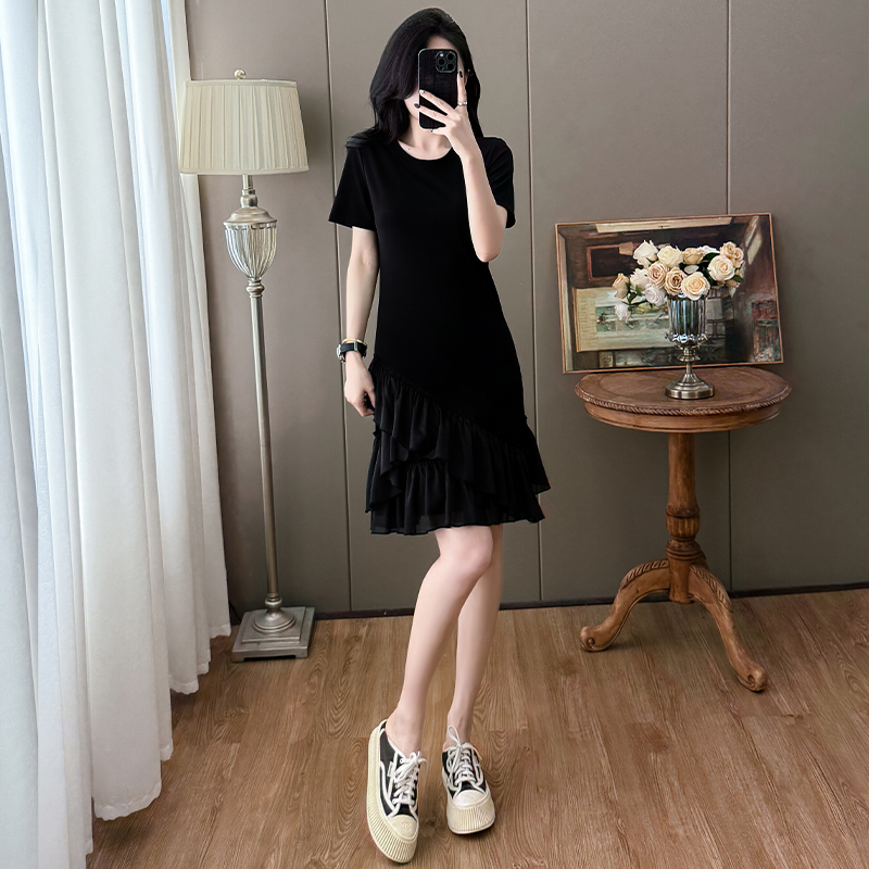 실사 작은 키 구름 실 패치워크 드레스 슬림해 보이는 표지 고기 레이스 커프스 중간 길이 빅 사이즈 티셔츠 치마 여성 여름