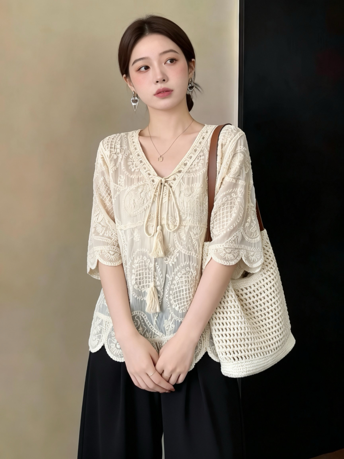 실사 빅 사이즈 프랑스식 홀로우 아웃 자수 V 넥 셔츠 레이스 자외선 차단 블라우스 여름 루즈핏 얇은 스타일 중간 소매 맨위