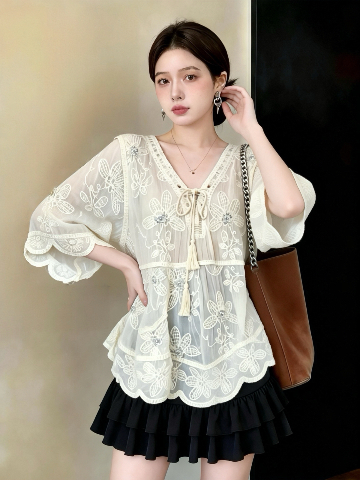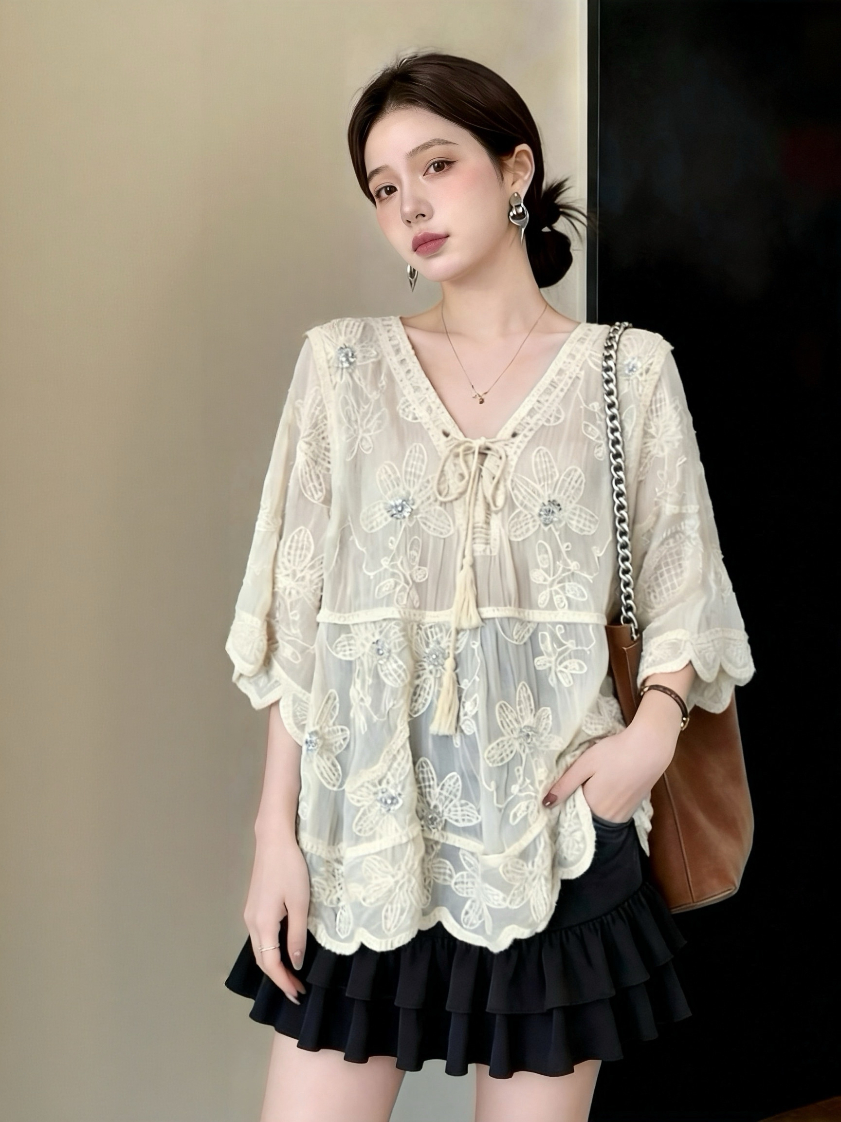 실사 빅 사이즈 프랑스식 홀로우 아웃 자수 V 넥 셔츠 레이스 자외선 차단 블라우스 여름 루즈핏 얇은 스타일 중간 소매 맨위