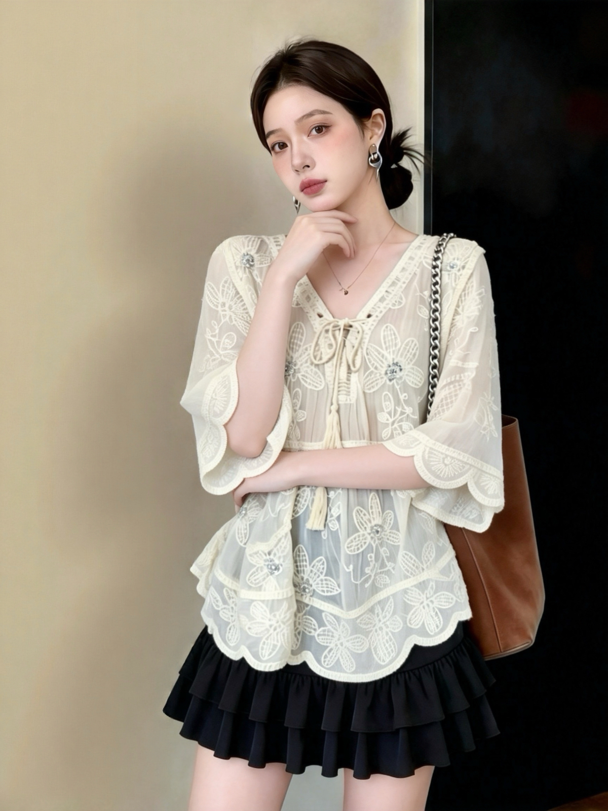 실사 빅 사이즈 프랑스식 무거운 작업 자수 레이스 V넥 레이스업 반팔 맨위 출퇴근 바람 품격 슬림해 보이는 레이스 셔츠