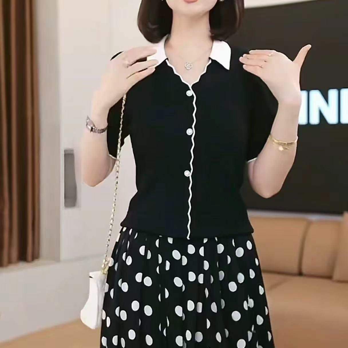 폴로 칼라 배색 얼음 실크 니트 반팔 여성 여름 새로운 V넥 단추 풀오버 티셔츠 품격 맨위