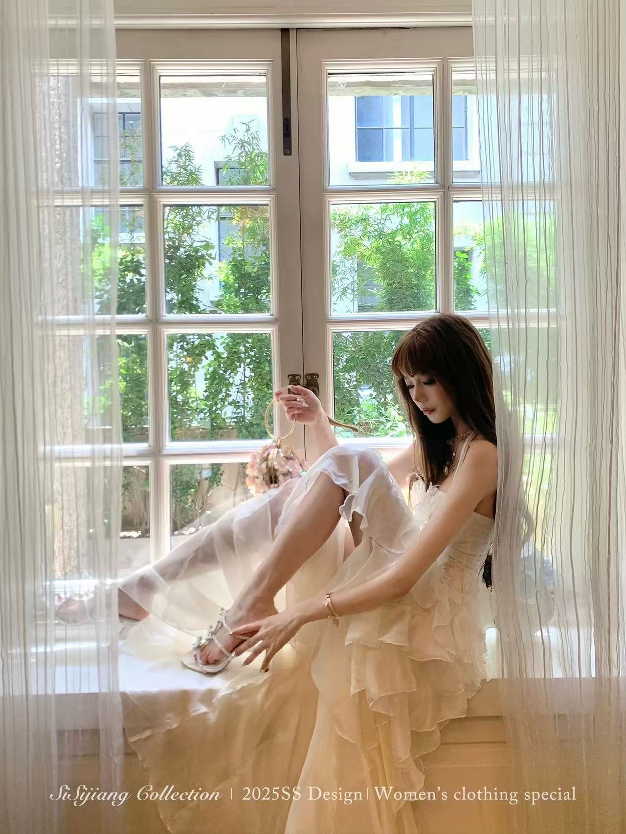 sisi jiang 정원 왈츠 프랑스식 우아함 품격 레이스 허리 수축 망사 꽃 큰 진자 롱 스커트