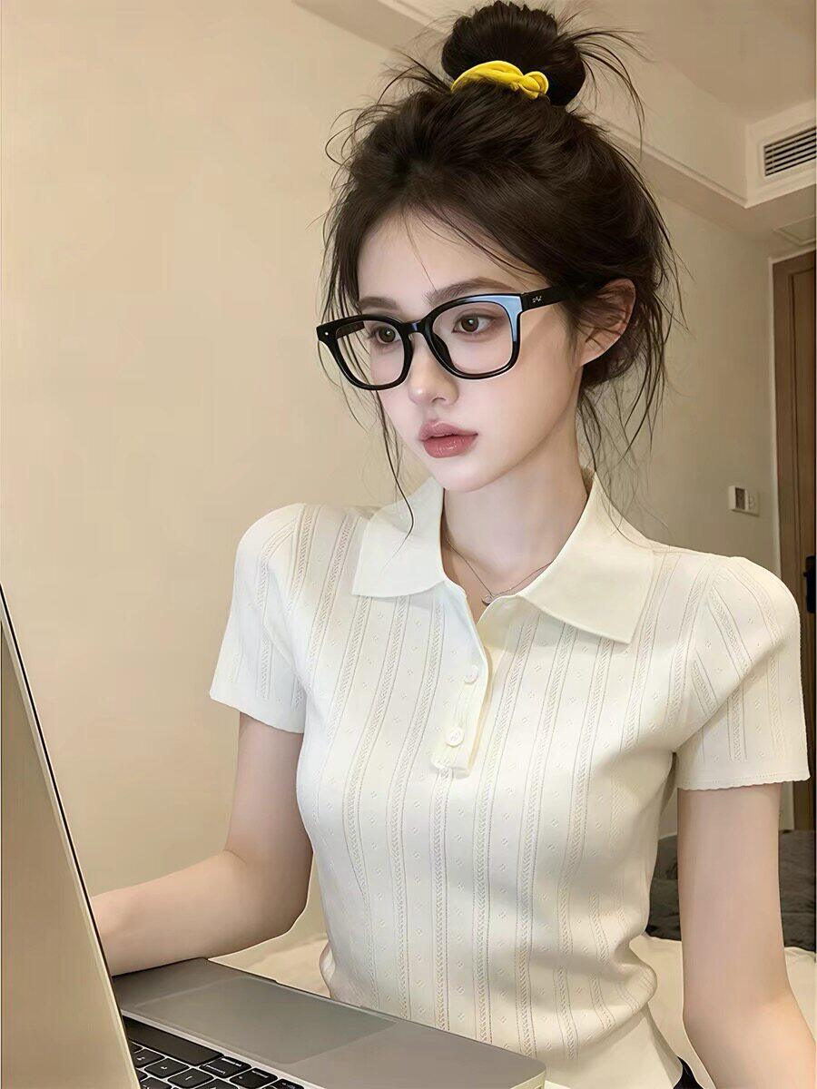 2026 여름 새로운 오래된 돈 바람 품격 작은 V넥 polo 니트 스웨터 여성 폴로 칼라 반팔 티셔츠 긍정적 인 어깨 의류
