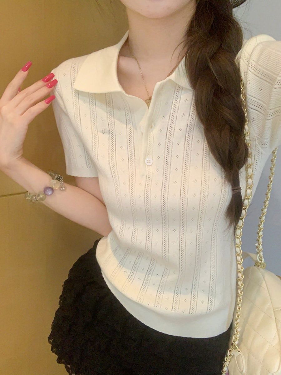 한 부서 부드러운 바람 POLO 칼라 니트 반팔 티셔츠 여성 여름 디자인 센스 세로 줄무늬 몸매 가꾸기 슬림해 보이는 짧은 맨위