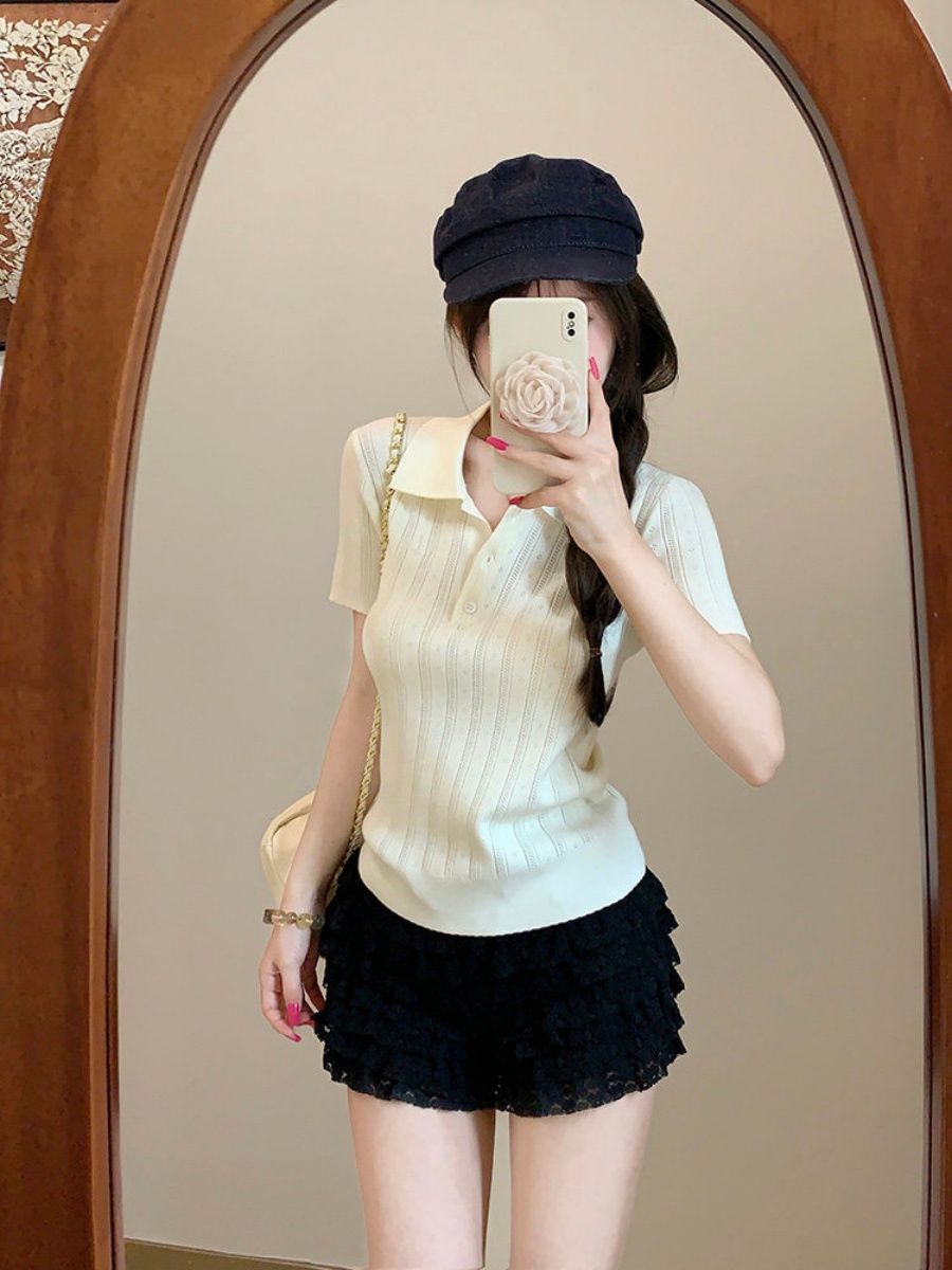 새로운 순수한 욕망 바람 루즈핏 슬림해 보이는 반팔 풀오버 맨위 여성 여름 폴로 칼라 패치워크 레이스 니트 스웨터 다용도 슬림해 보이는