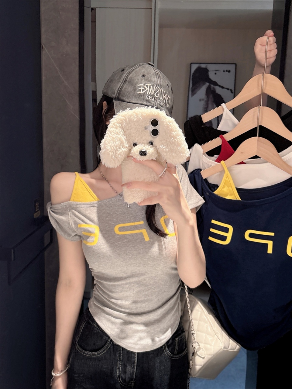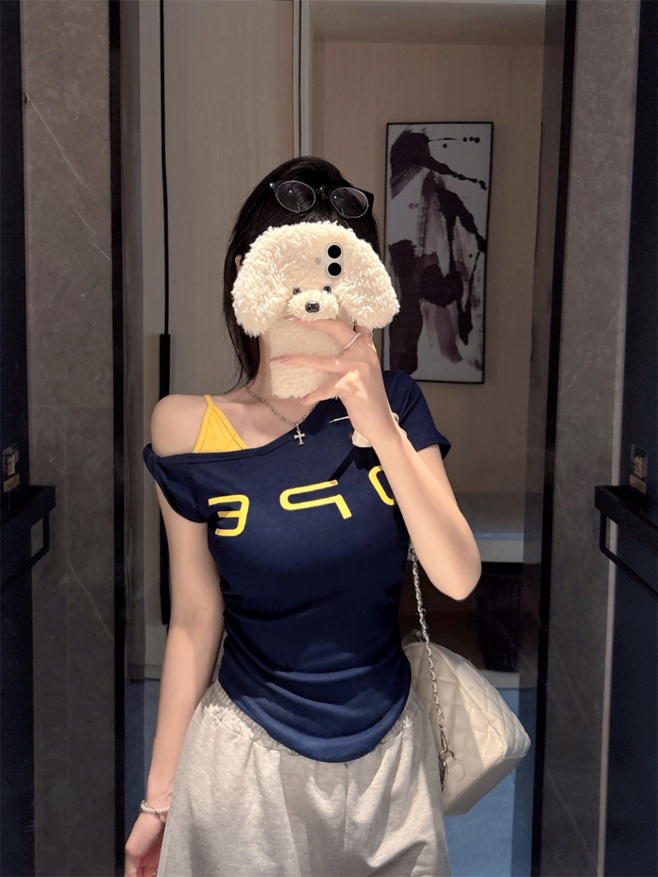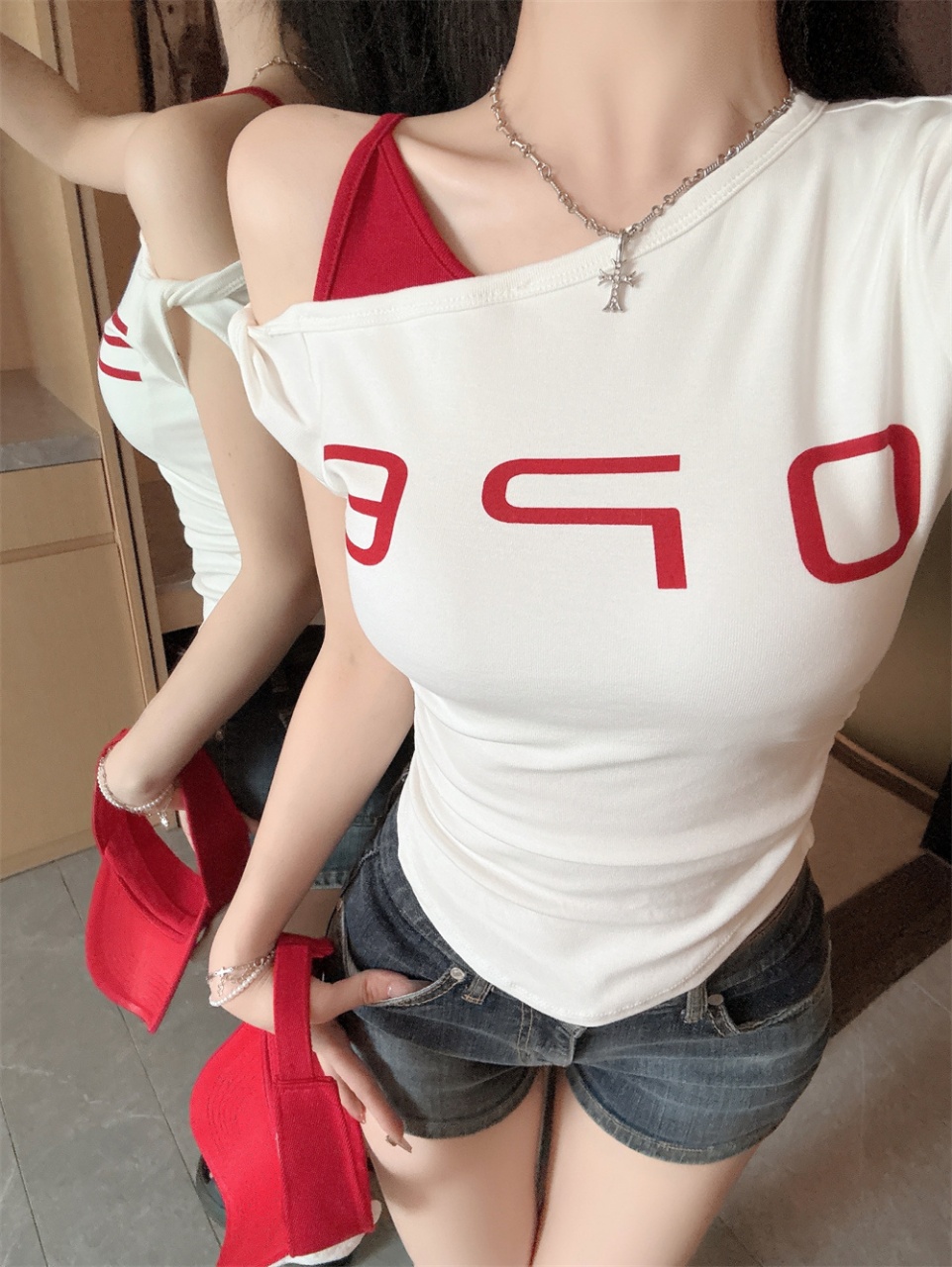 220 그램 92 면 8 암모니아 Lun 아메리칸 핫걸 비스듬한 어깨 알파벳 프린트 반팔 티셔츠 여성