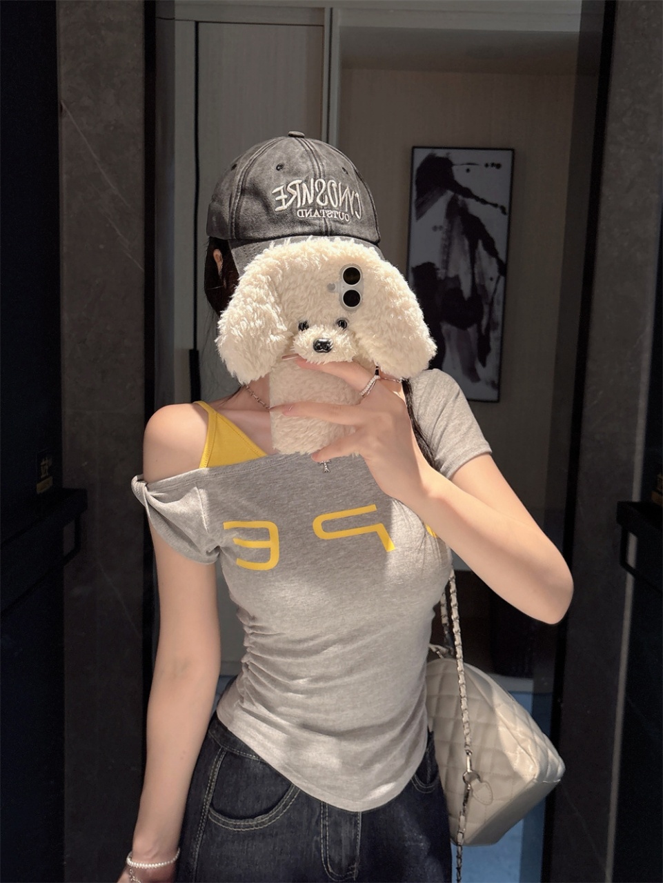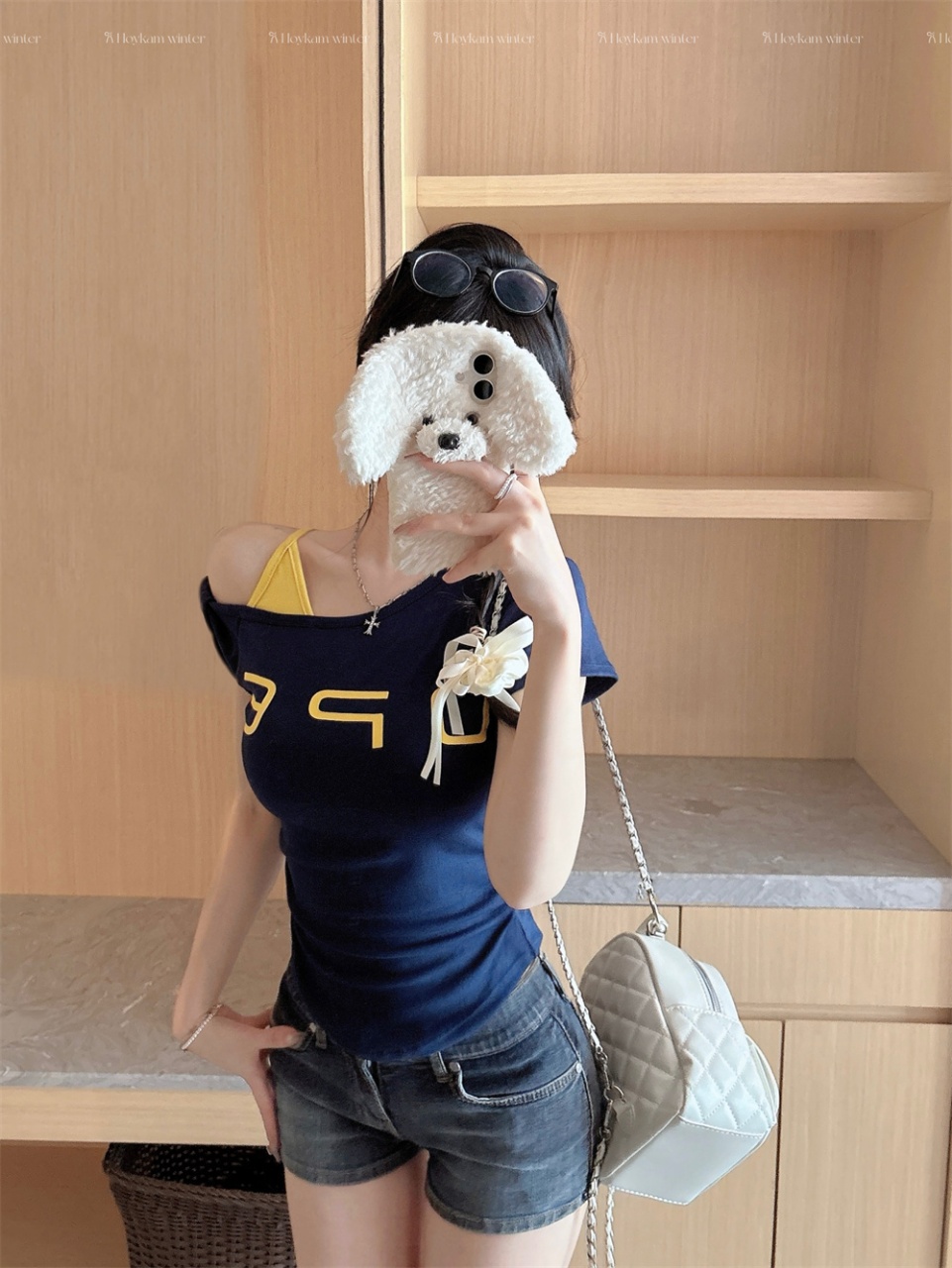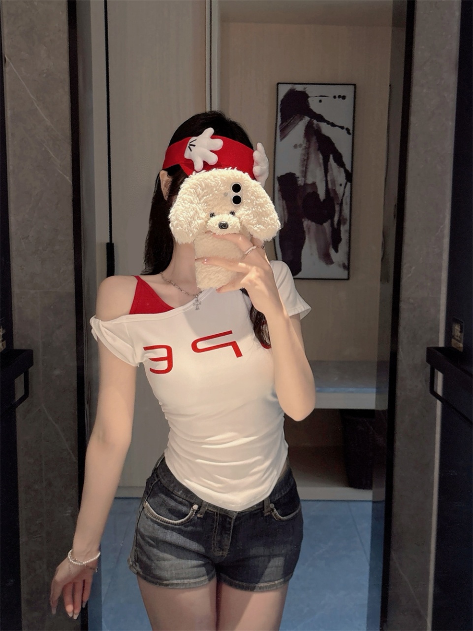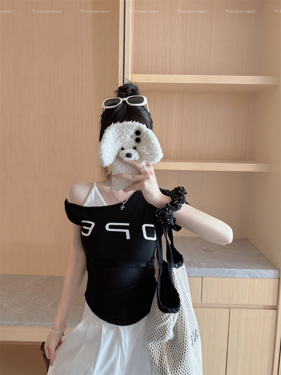 220 그램 92 면 8 암모니아 Lun 아메리칸 핫걸 비스듬한 어깨 알파벳 프린트 반팔 티셔츠 여성